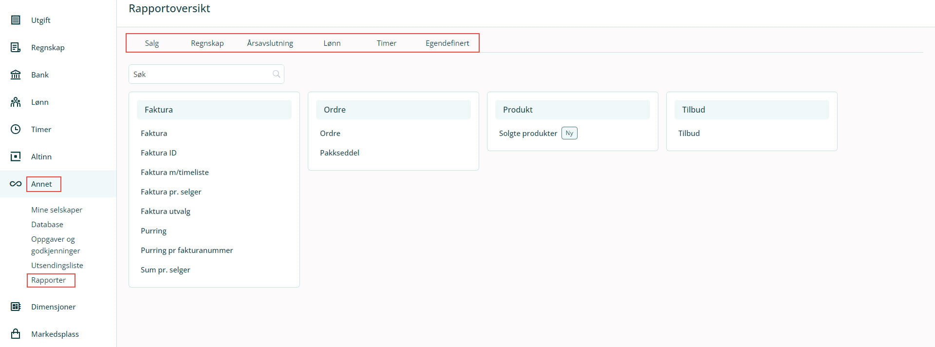 Under Annet → Rapporter finner du rapporter kategorisert etter systemets moduler. Du kan velge hvilken modul du ønsker å se rapporter for ved å klikke på fanen øverst i rapportoversikten. Her finner du forhåndsdefinerte rapportutdrag.