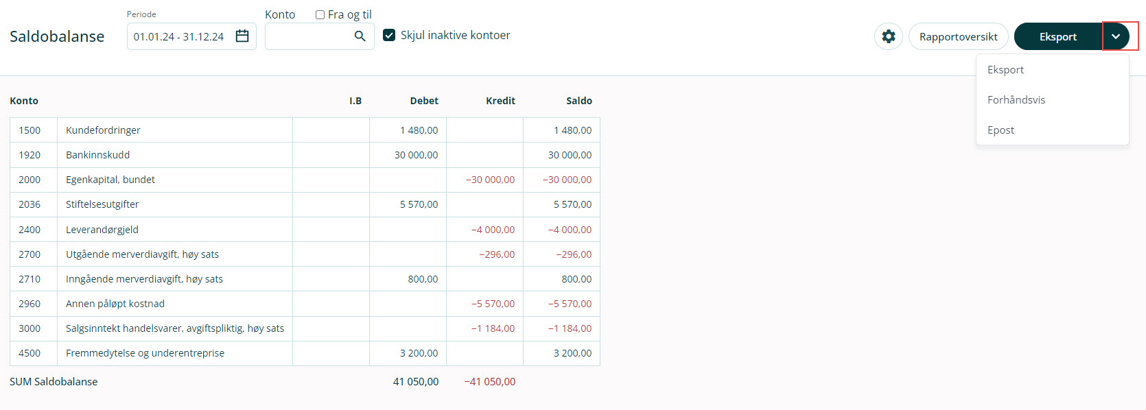 NB: Hvis du ønsker å ta ut en ren Excel-fil som kan brukes til avstemming, anbefaler vi å bruke funksjonen Oversikt.