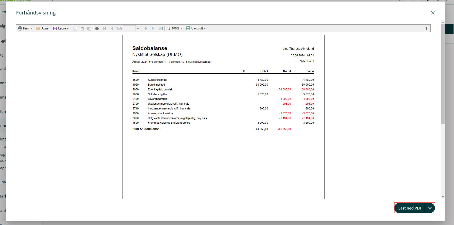 Fra forhåndsvisningen av rapporten kan du eksportere til PDF-format eller velge andre filformater som Excel eller CSV ved å trykke på pilen til høyre ved knappen Last ned PDF. Vær oppmerksom på at Excel-filen som eksporteres vil ha rapportformat, ikke rent Excel-format.