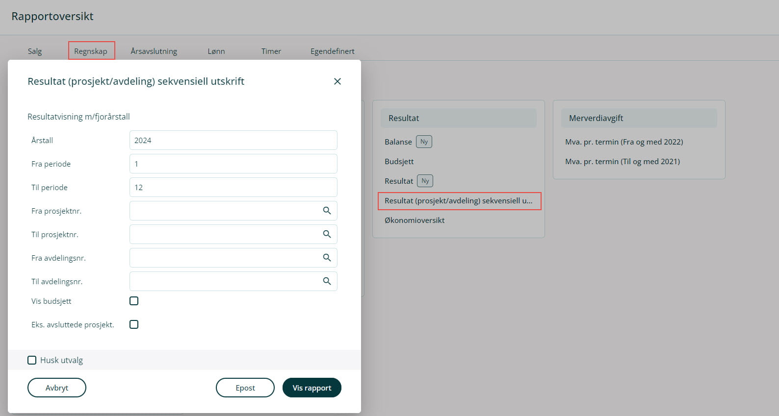 Rapporten viser tallene for årets og fjorårets resultat i en sekvensiell utskrift, med mulighet for å velge avdeling og/eller prosjekt, samt totalt for alle år. Hvis du velger flere prosjekter eller avdelinger i utvalget, vil du motta en separat rapport per prosjekt og avdeling.