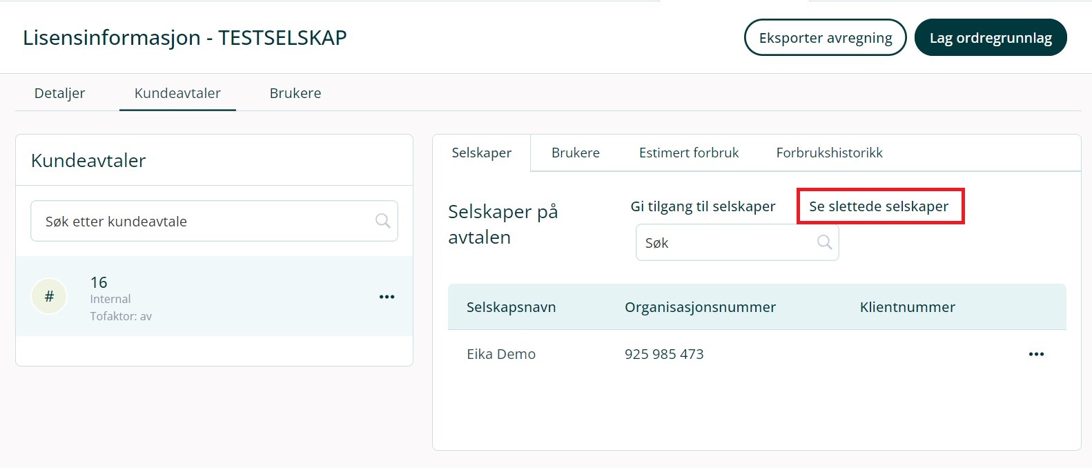 1. Klikk på Se slettede selskaper under aktuell kundeavtale for å få opp en listevisning med slettede selskaper.