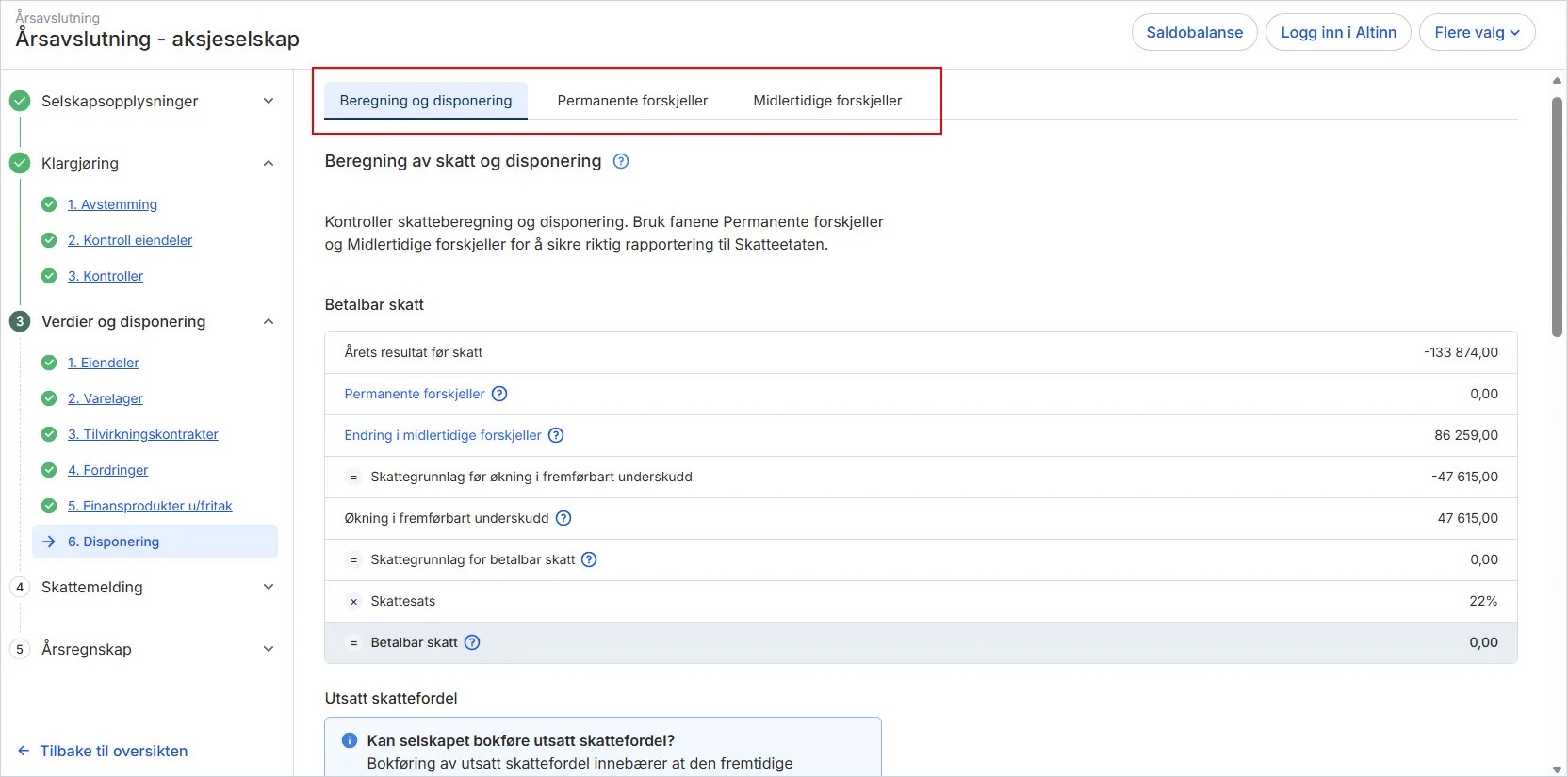 I dette steget beregner systemet betalbar skatt og utsatt skatt eller skattefordel, i tillegg til årets resultat etter skatt og disponeringen av dette.
