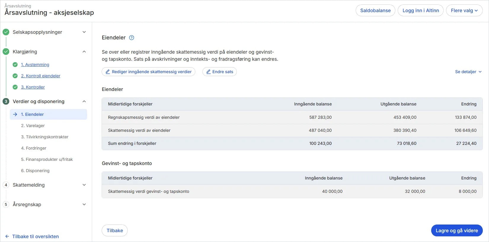 I dette understeget får du oversikt over inngående skattemessige verdier på eiendeler og gevinst- og tapskonto. Inngående skattemessige verdier hentes fra fjorårets skattemelding og skal ikke endres. Hvis tallene ikke stemmer, bør fjorårets skattemelding rettes. Hvis fjorårstall ikke ble hentet kan du legge inn skattemessige verdier på både eiendeler og gevinst- og tapskonto i dette steget.
