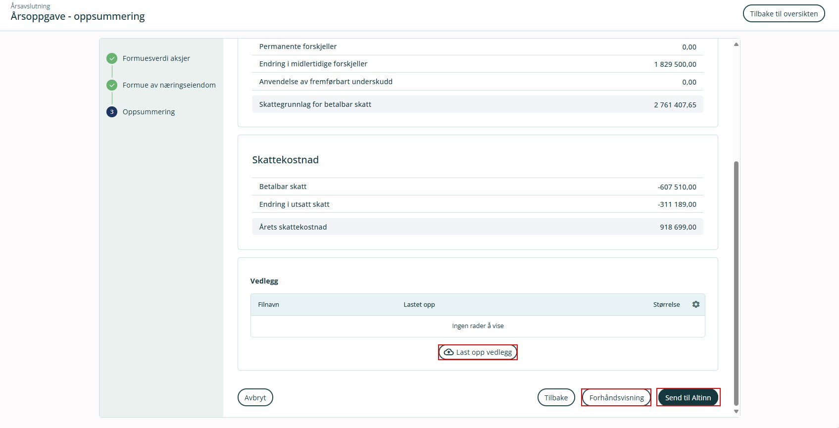 Til slutt ser du en oppsummering av tallene i årsoppgaven (skattegrunnlag for betalbar skatt og årets skattekostnad) som sendes til Altinn. Her har du også anledning til å laste opp vedlegg, og disse vil legge seg sammen med skattemeldingen og næringsspesifikasjonen i Altinn.