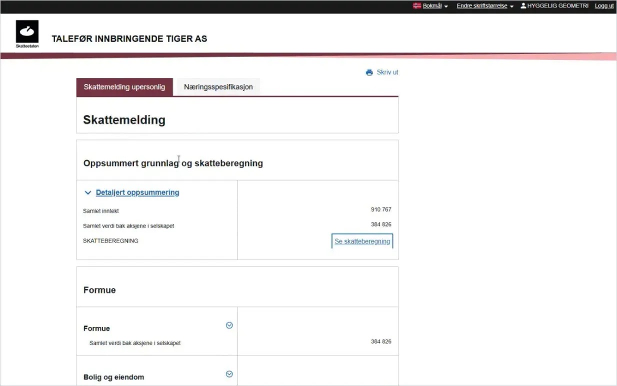 Til slutt får du en oppsummering av skattepliktig inntekt og årets skattekostnad.