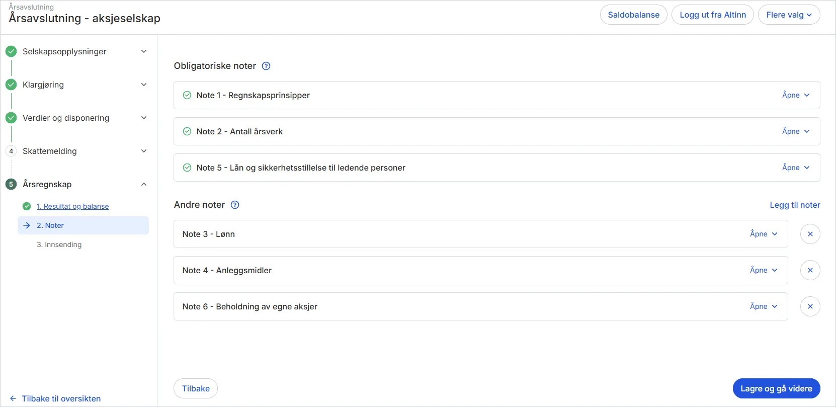 I dette steget presenteres et resultat- og balanseregnskap. For noen av postene er det tilhørende noter. Systemet oppretter automatisk forslag til noter som trengs, med tekstforslag som kan redigeres. Du kan også opprette helt egne noter.