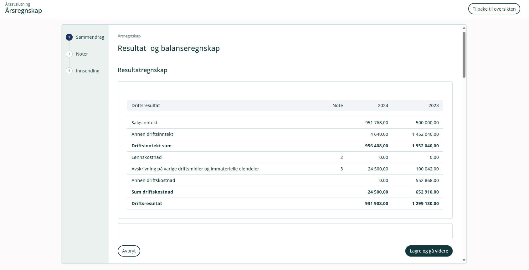Se over at regnskapet ser riktig ut (bla helt ned) og klikk på Lagre og gå videre.
