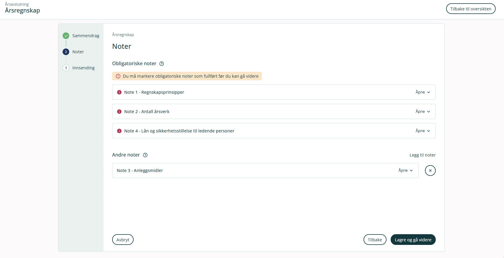 Du kommer nå til noter. Disse er delt opp i obligatoriske noter og andre noter. Notene må godkjennes før du kan gå videre, og dette gjøres ved å klikke direkte på aktuell note. De obligatoriske notene i årsregnskapet er lovpålagte og gir kritisk informasjon som må rapporteres for å oppfylle regnskapsstandarder og krav. Under Andre noter fyller du ut de som er relevante for deg, og her kan du også legge til eller fjerne noter. Er det data i notene bør du se over dette før du sender inn.