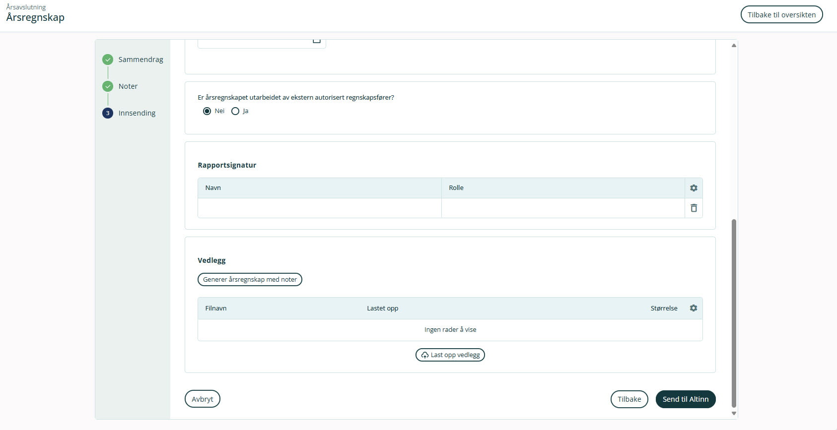I siste trinn legger du inn dato for fastsettelse av årsregnskapet og svarer på om regnskapet er utarbeidet av ekstern autorisert regnskapsfører eller ikke. Under Rapportsignatur legger du inn navnet på de som skal signere årsregnskapet. Klikk på Generer årsregnskap med noter. Du kan også laste opp andre vedlegg. Klikk på Lagre og deretter Send til Altinn.