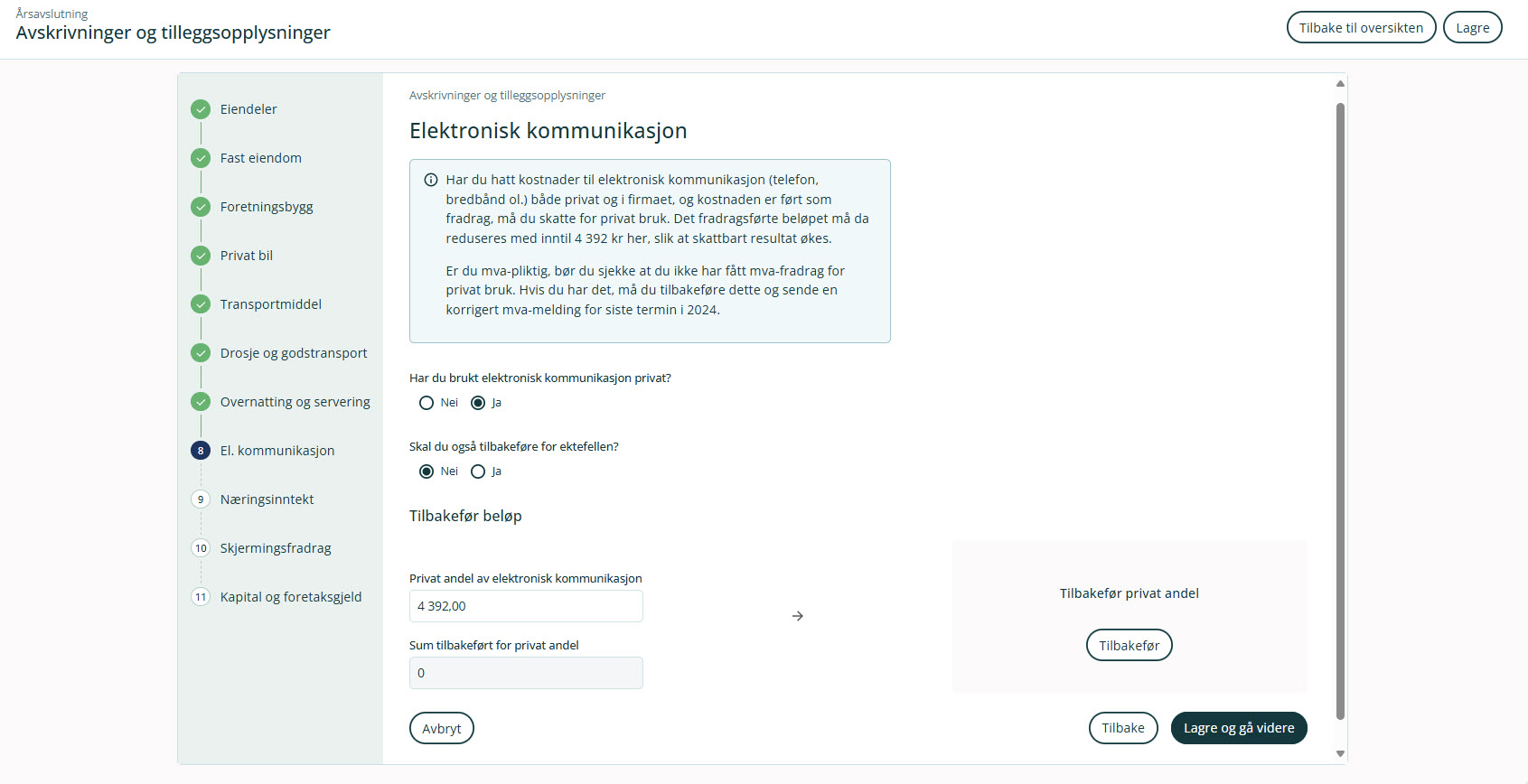 Her kan du tilbakeføre privat andel for kostnader til elektronisk kommunikasjon (telefon, bredbånd og lignende).