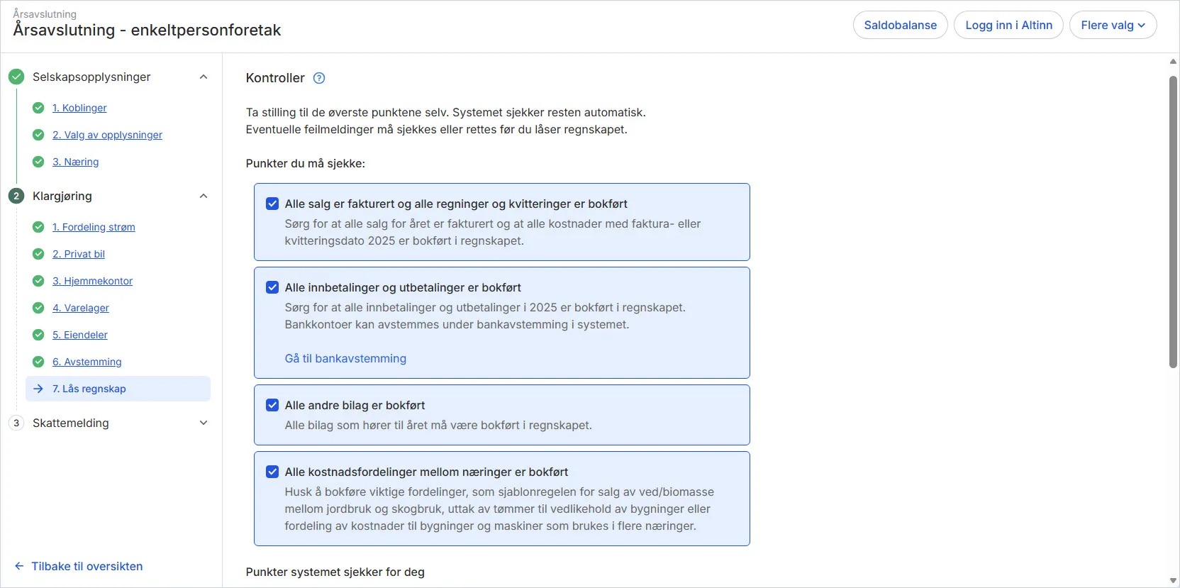 Det er viktig at alle bilag som tilhører året du skal levere for, er registrert i regnskapet, og at alle periodiseringer er gjort. - Har du bokført alle kostnadsfordelinger mellom næringer? (kun for landbruk)