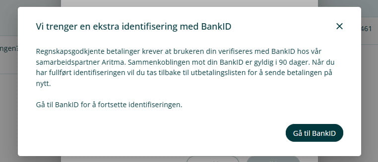 - Når en eksisterende bankbruker forsøker å utføre sin første betaling, vil det komme opp et varsel om at BankID ikke er verifisert eller har utløpt.