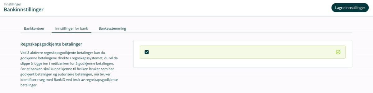 For å gå tilbake til manuell ettergodkjenning i banken, kan du gjøre følgende: Gå til Innstillinger i toppmenyen og velg Bank. Gå til fanen Innstillinger for bank, og fjern deretter haken under avsnittet for Regnskapsgodkjente Betalinger.