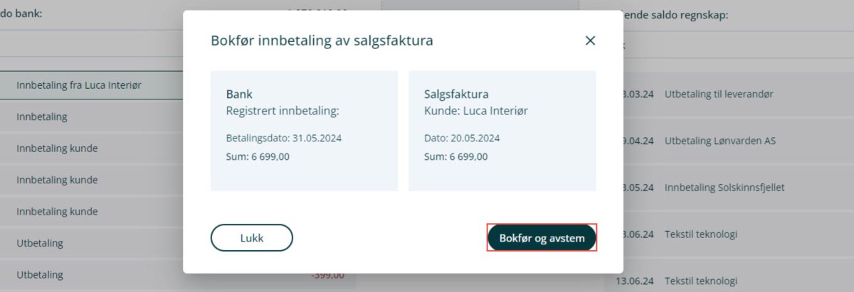 Du får nå opp et nytt vindu som viser bankinnbetalingen og salgsfakturaen.