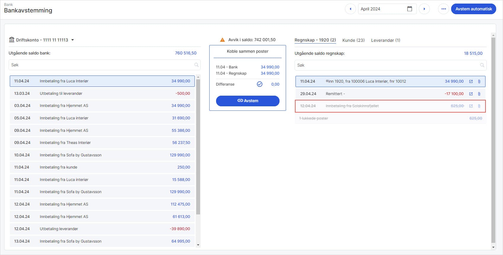 Den vanligste feilen er en differanse mellom saldoen i regnskapet (for eksempel konto 1920) og saldoen i banken. Dette skyldes ofte at den første måneden med bankavstemming ikke er fullstendig avstemt.