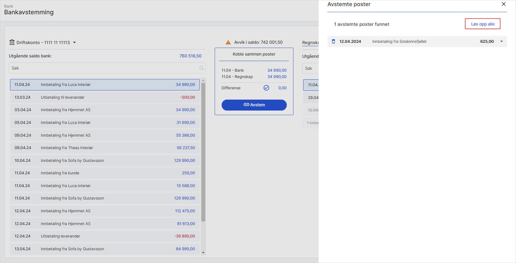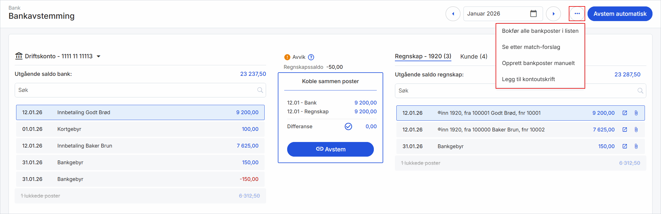 Det er mulig å avstemme poster på tvers av år. Har du for eksempel en banktransaksjon i desember 2025 som skal matches mot en regnskapspost i 2026, kan postene lukkes i januar 2026 eller senere. Det er ikke mulig å lukke dem i desember dersom regnskapsposten ligger i januar.