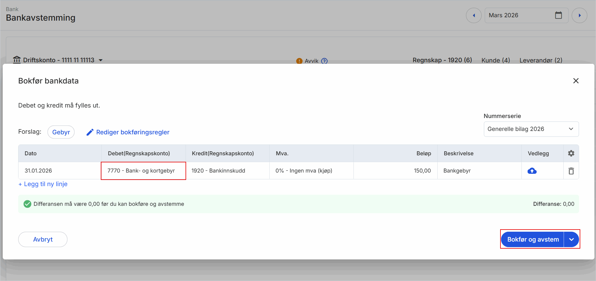 - Differanse mellom saldo i regnskapet og saldo i bank