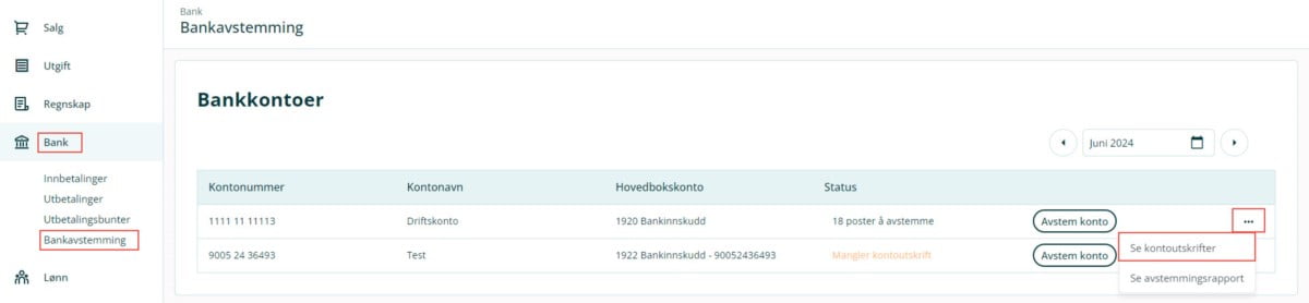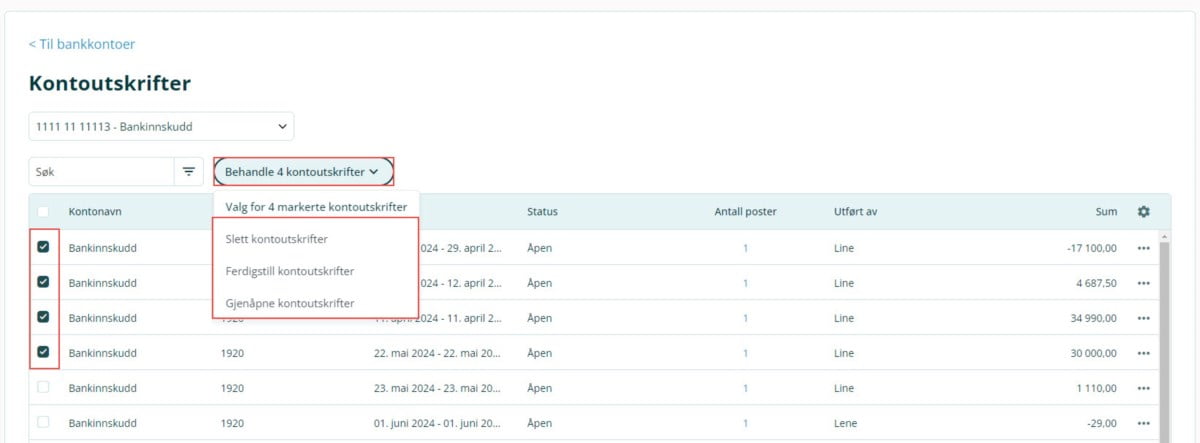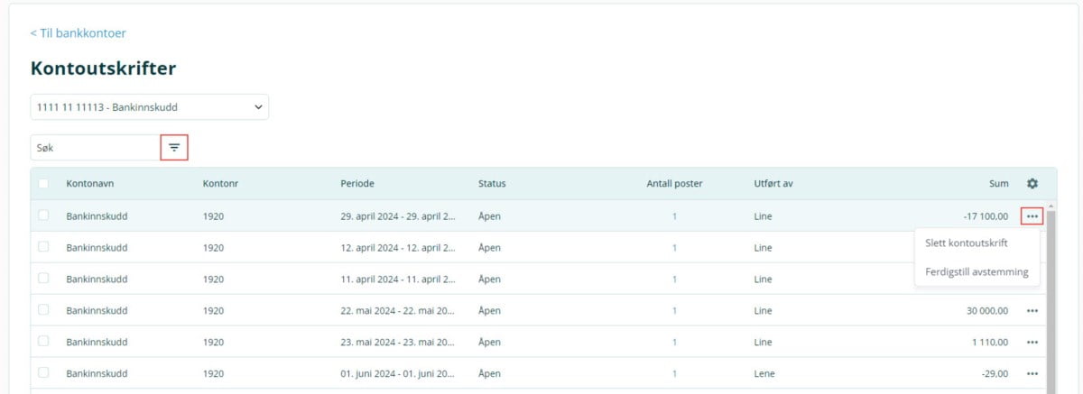 Ved å klikke på de tre kulepunktene på en kontoutskriftlinje, kan du velge Slett kontoutskrift eller Ferdigstill avstemming. Sistnevnte vil sende deg direkte til bankavstemming.