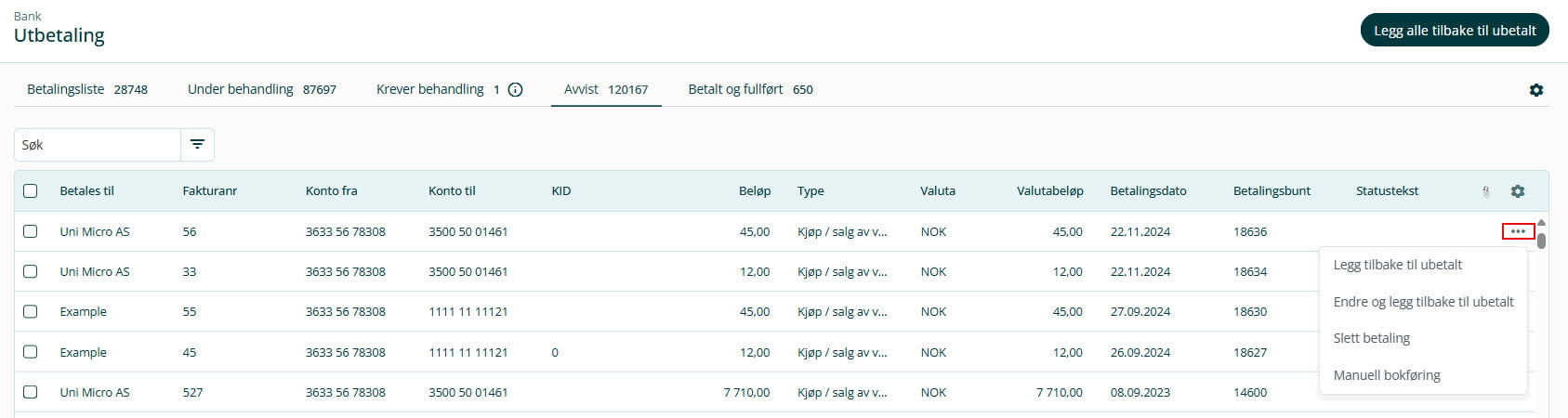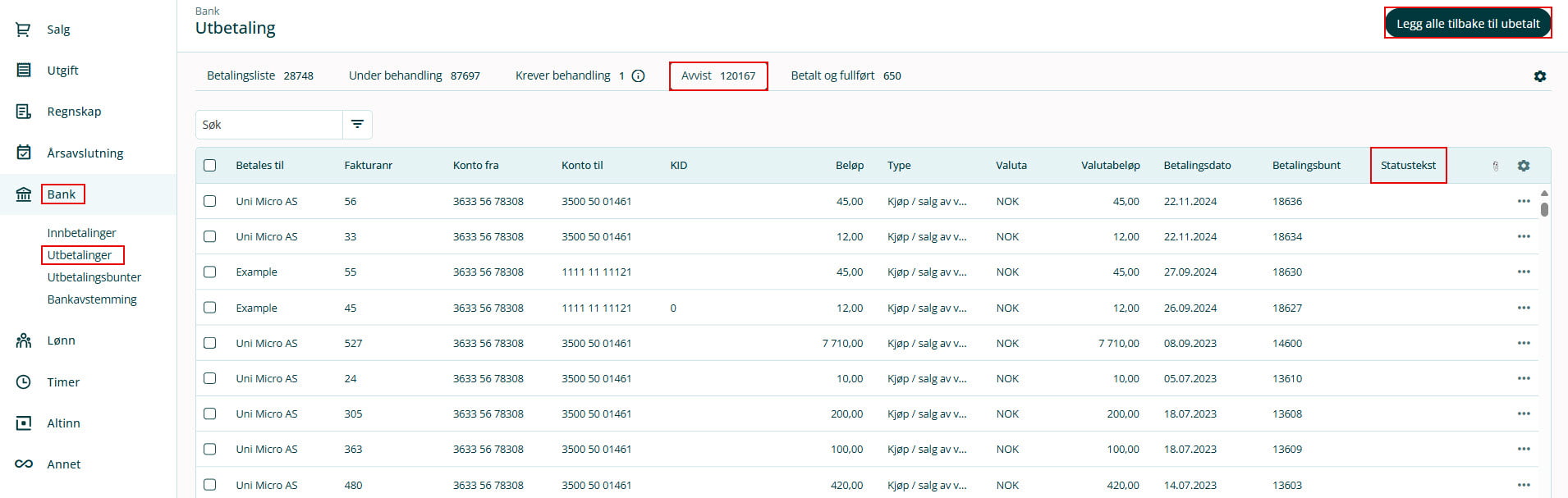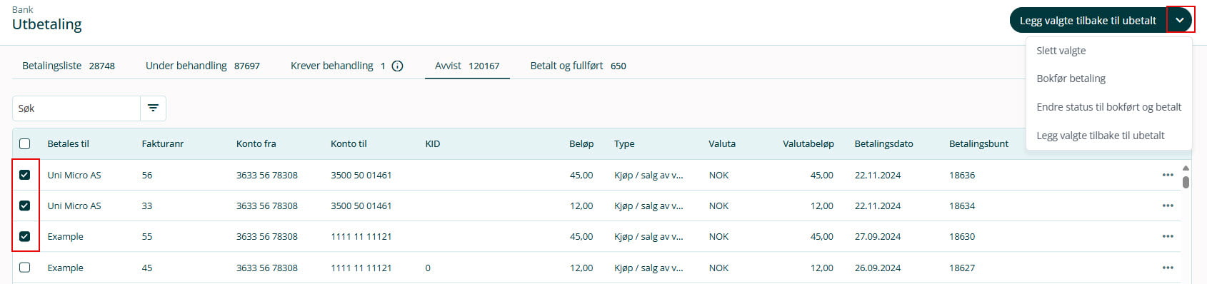 I feltet Statustekst får du vanligvis en indikator på hva som har feilet, for eksempel feil/ugyldig KID, manglende godkjenningsrettigheter i banken, eller at betalingen er slettet manuelt. Dersom du ønsker å legge alle de avviste betalingene tilbake i betalingslisten klikker du på Legg alle tilbake til ubetalt.