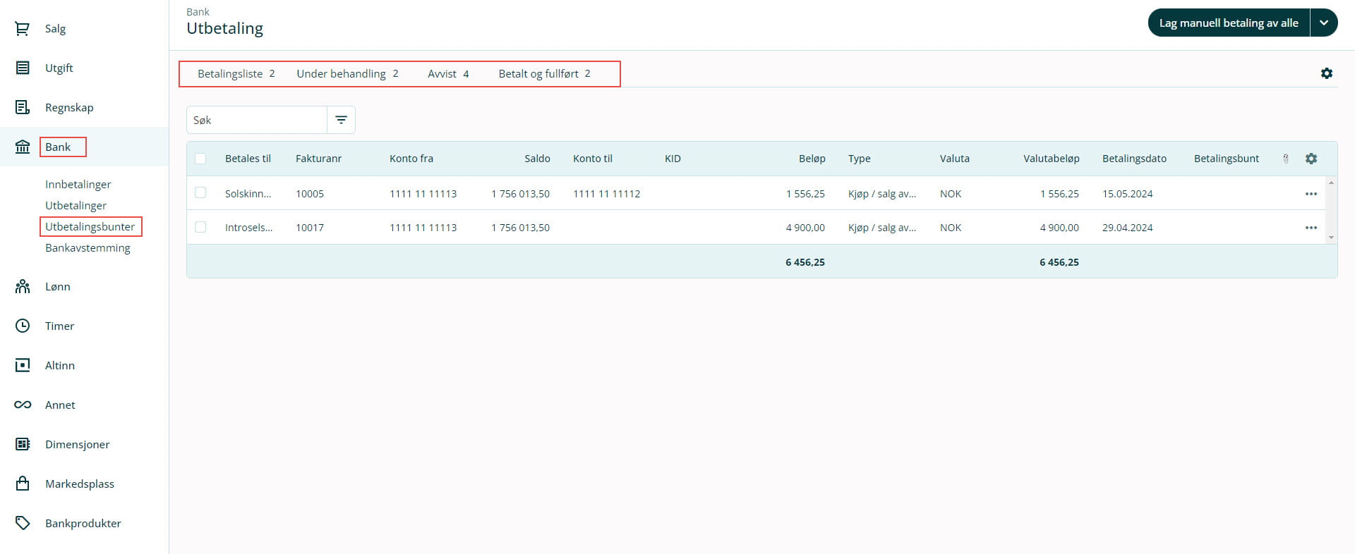 Gå til Bank i venstremenyen og velg Utbetalinger. Dette gir deg en oversikt over alle utbetalinger i systemet, og du har følgende fanevalg:
