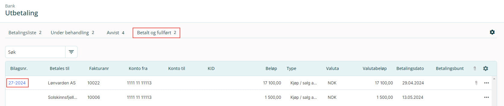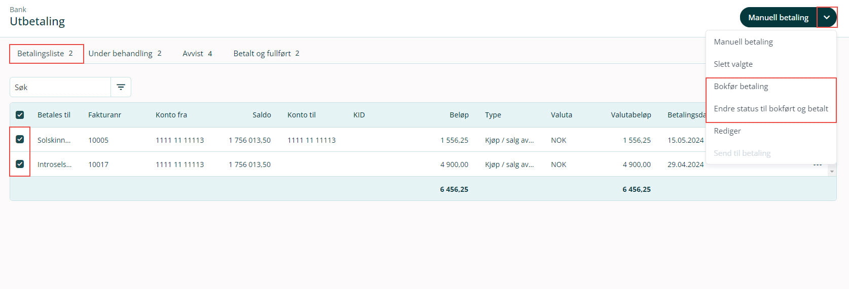 Dette er alle betalinger som er klare for å sendes til bank. Velger du Send alle til betaling sendes samtlige betalinger i listen. Ønsker du å bare sende utvalgte betalinger, setter du hake ved disse og klikker på Send til betaling. Før du sender betalingene, kan du se totalbeløpet for de markerte postene. Ved å klikke på nedtrekkslisten får du flere valg.Hvis du ønsker å bokføre betalingen, for eksempel hvis den er betalt manuelt i banken, kan du velge Bokfør betaling. Hvis du kun ønsker å endre statusen på betalingen uten å bokføre den, kan du velge Endre status til bokført og betalt. Vær oppmerksom på at dette valget ikke vil bokføre betalingen.