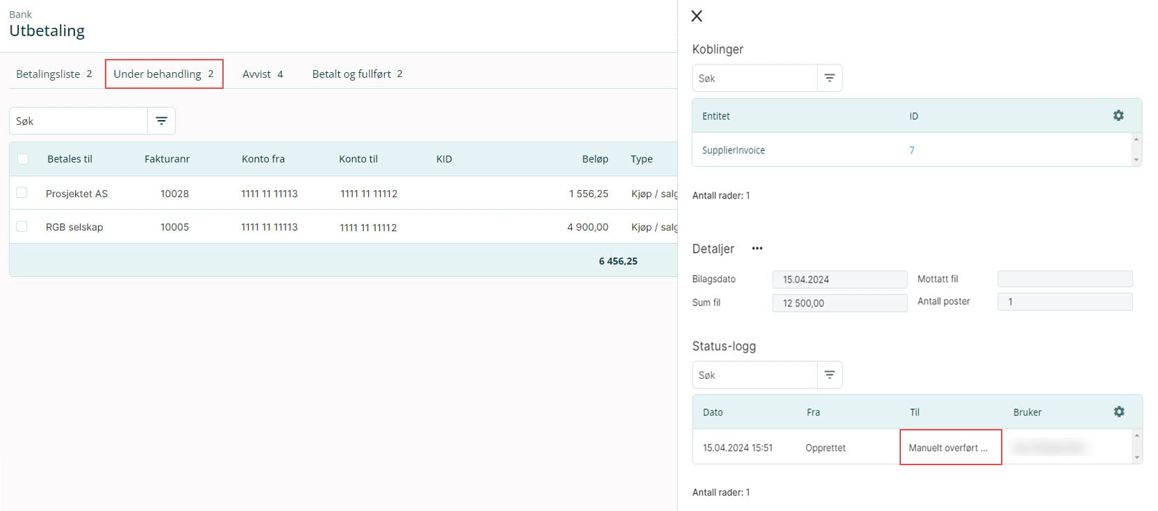 Hvis du vil gå direkte til aktuell leverandørfaktura, kan du klikke på det aktive nummeret under ID, og ved å klikke på Status-logg kan du se hvor i prosessen betalingen befinner seg.