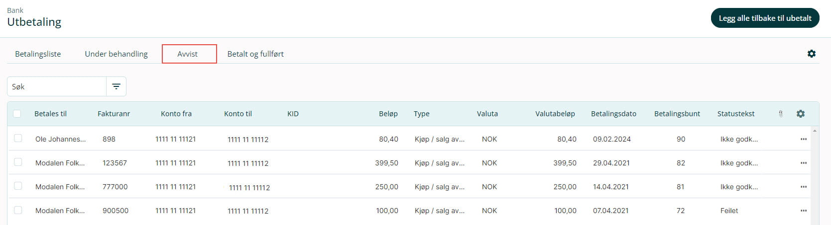 Dette er alle betalinger som er sendt til banken. Du kan klikke på en betaling for å se hvor i prosessen den befinner seg. Betalinger vil ha en av følgende fire statuser: