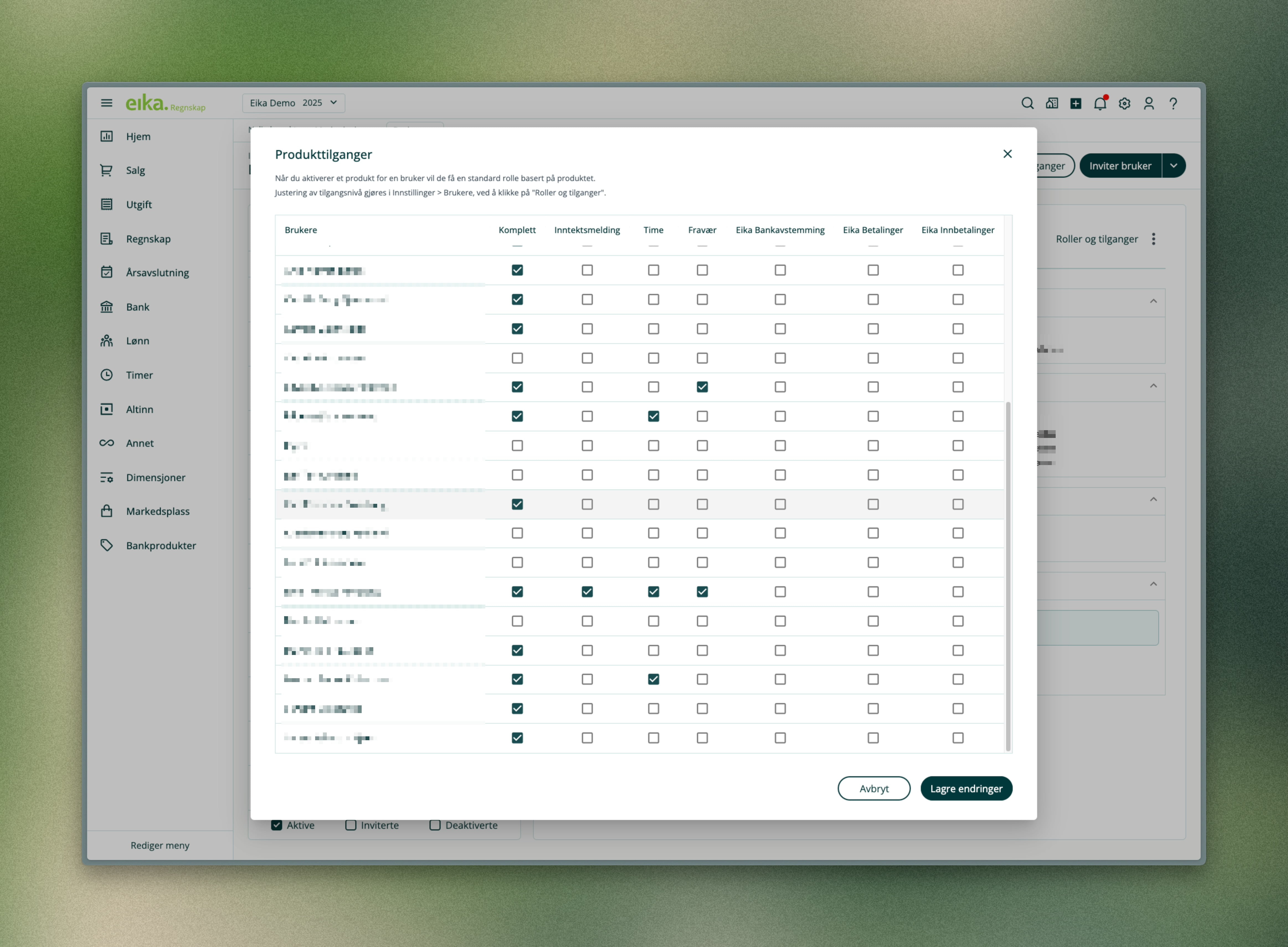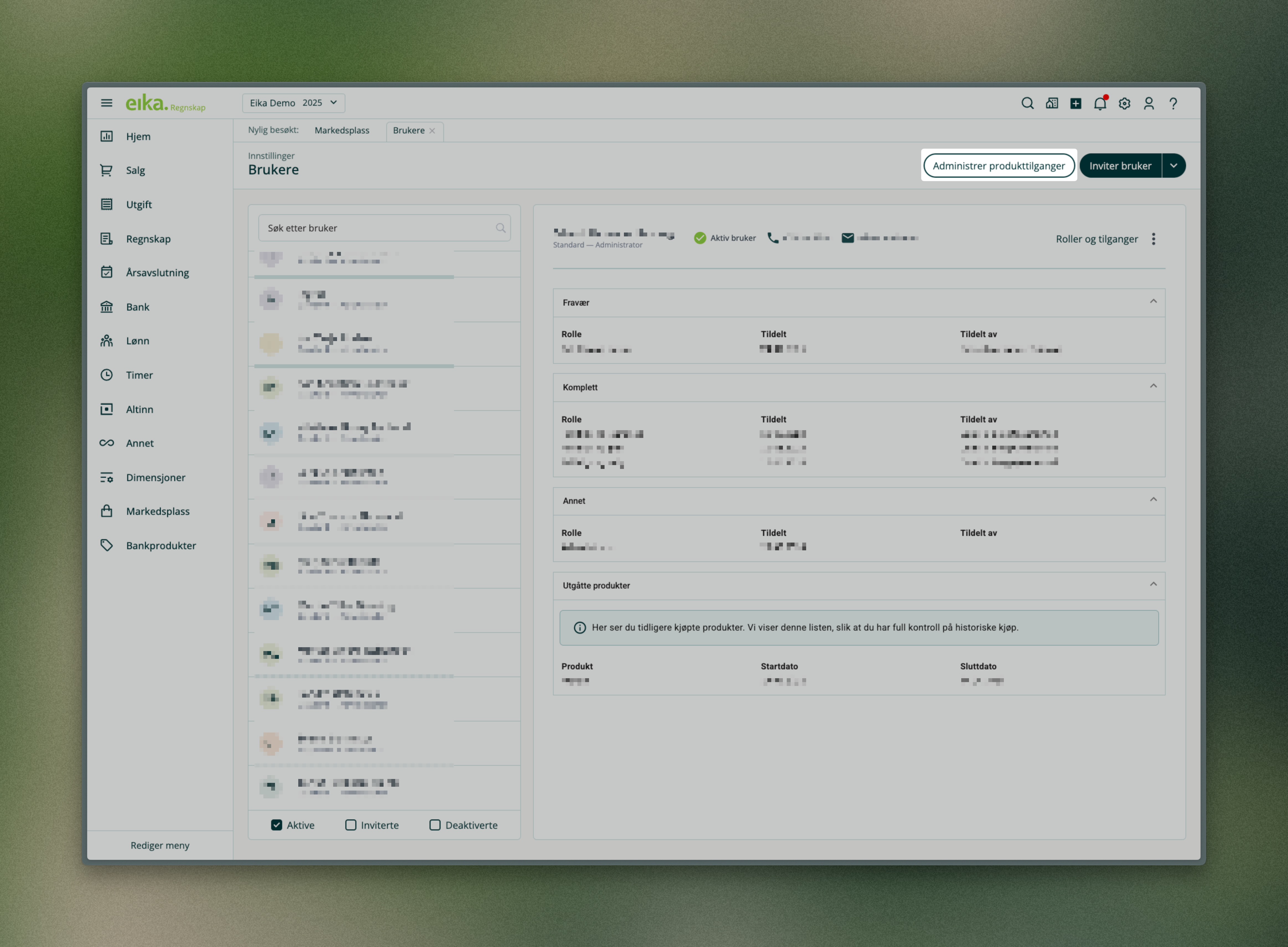 Produkttilganger kan administreres for alle selskapets brukere samtidig, eller enkeltvis.