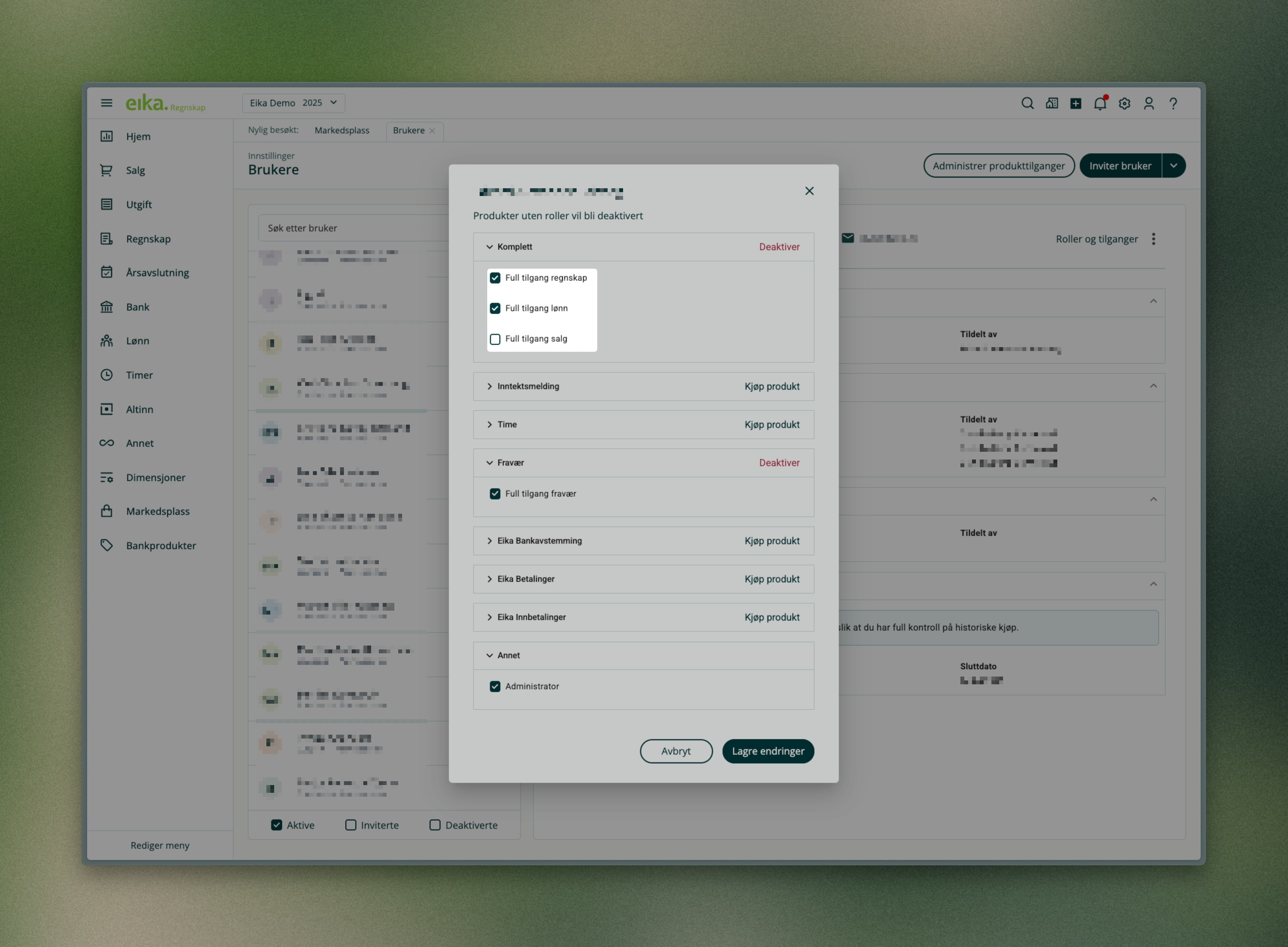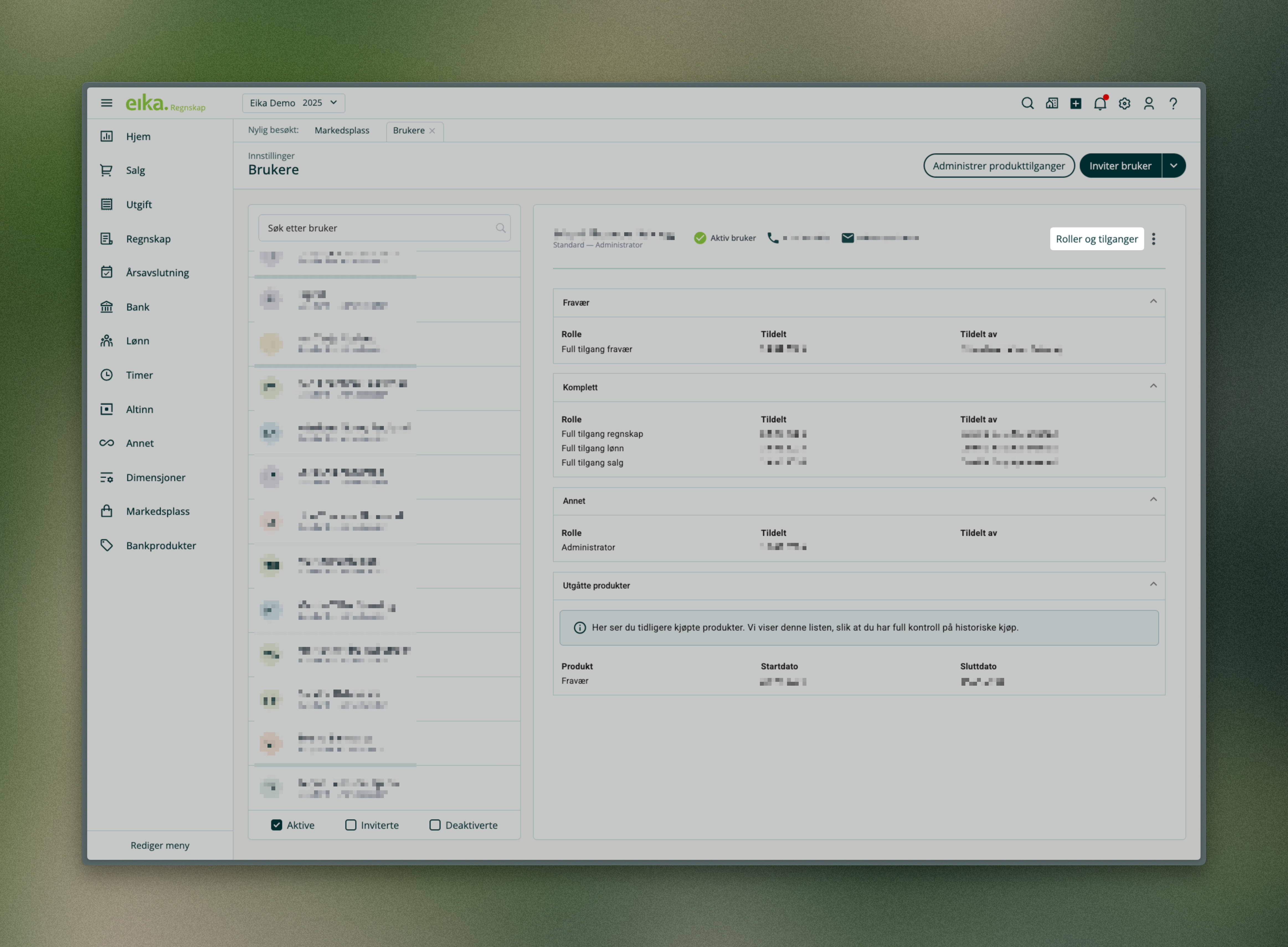 Klikk på Kjøp produkt for det produktet du ønsker, og tildel deretter de aktuelle rollene du ønsker at brukeren skal ha. Du kan deaktivere tilgangene til en bruker enten ved å klikke på Deaktiver eller ved å fjerne haken ☑ ved aktuell tilgang.