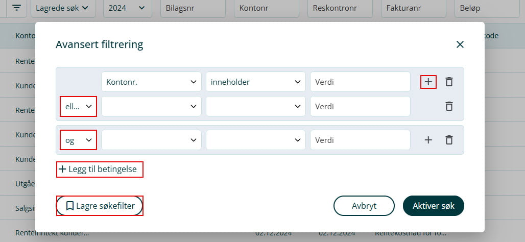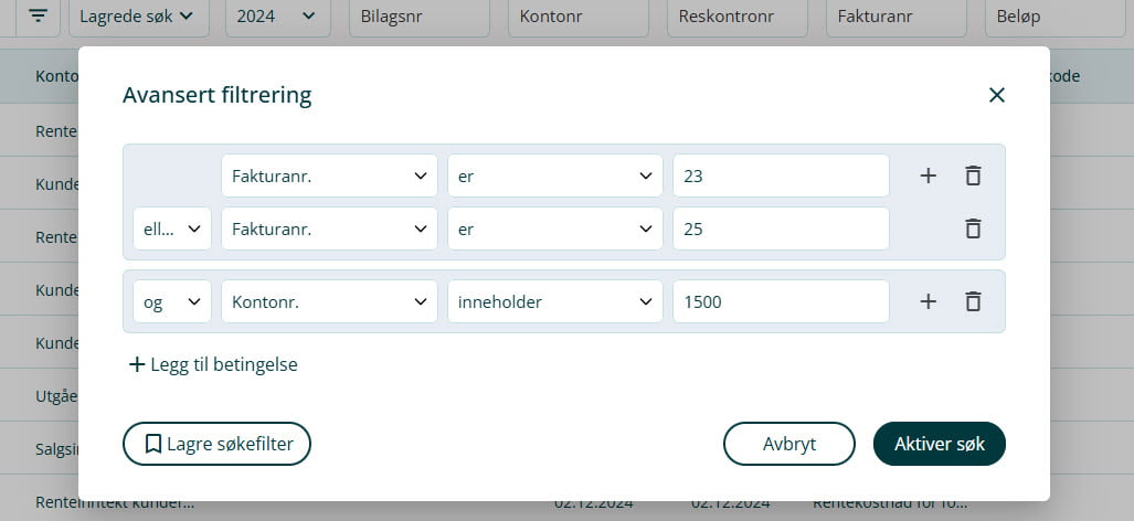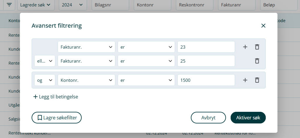 3. I filtreringen kan du sette opp flere betingelser. Betingelsene skilles mellom og og eller. Hvis du bruker og, må begge kriteriene være oppfylt for at linjene skal vises i søket. Hvis du bruker eller, holder det at ett av kriteriene er oppfylt for at linjen skal vises.