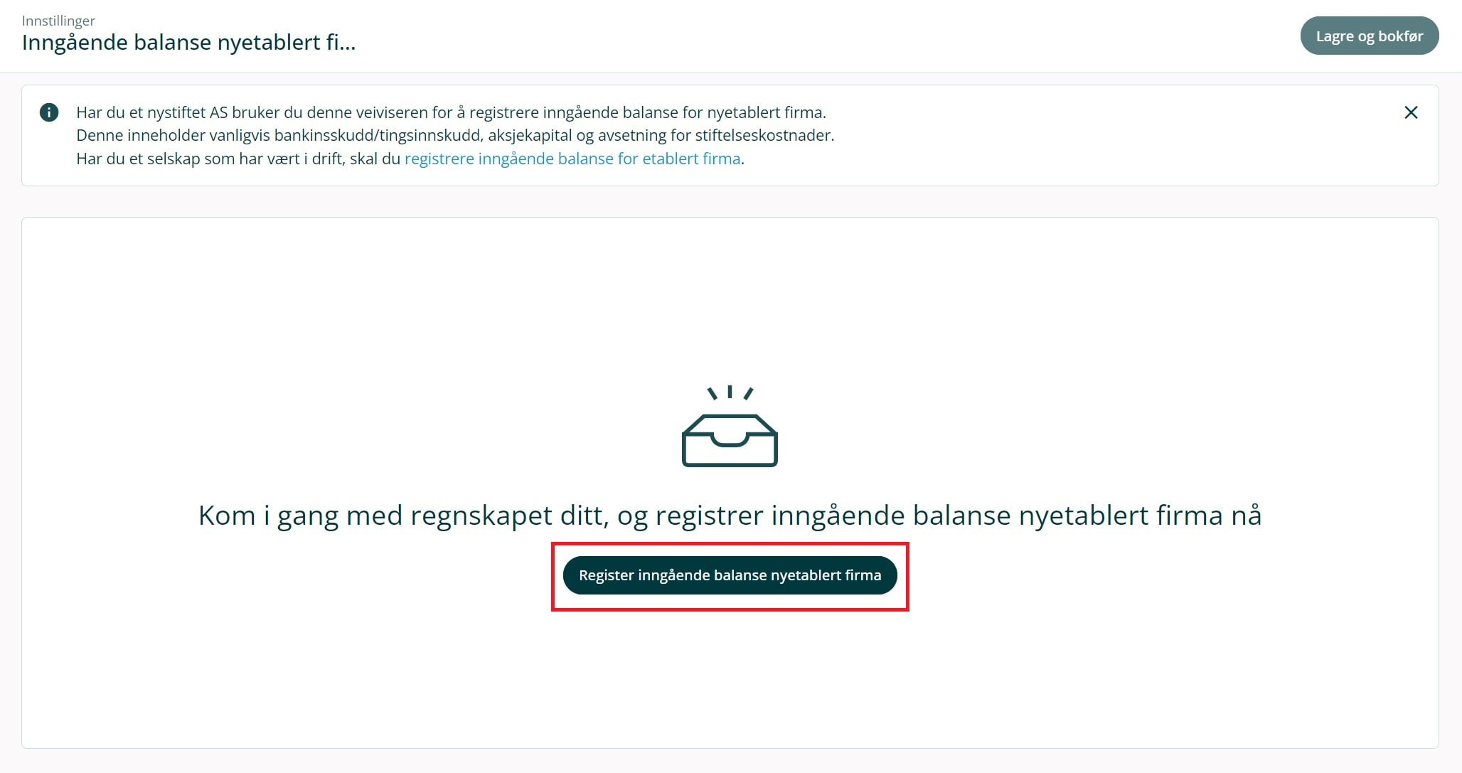 Her legger du inn informasjon om hvordan et nytt aksjeselskap registrerer inngående balanse.
