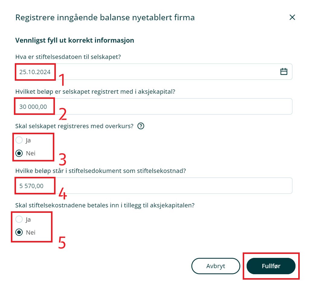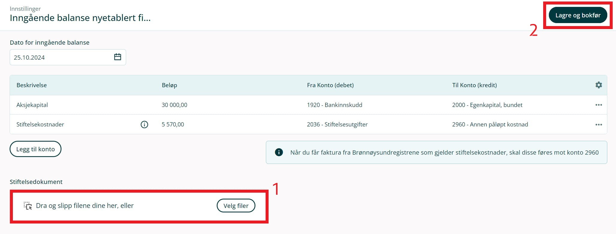 Et nytt aksjeselskap må registrere inngående balanse ved etableringen. En typisk inngående balanse består av aksjekapital og stiftelsesgebyr.