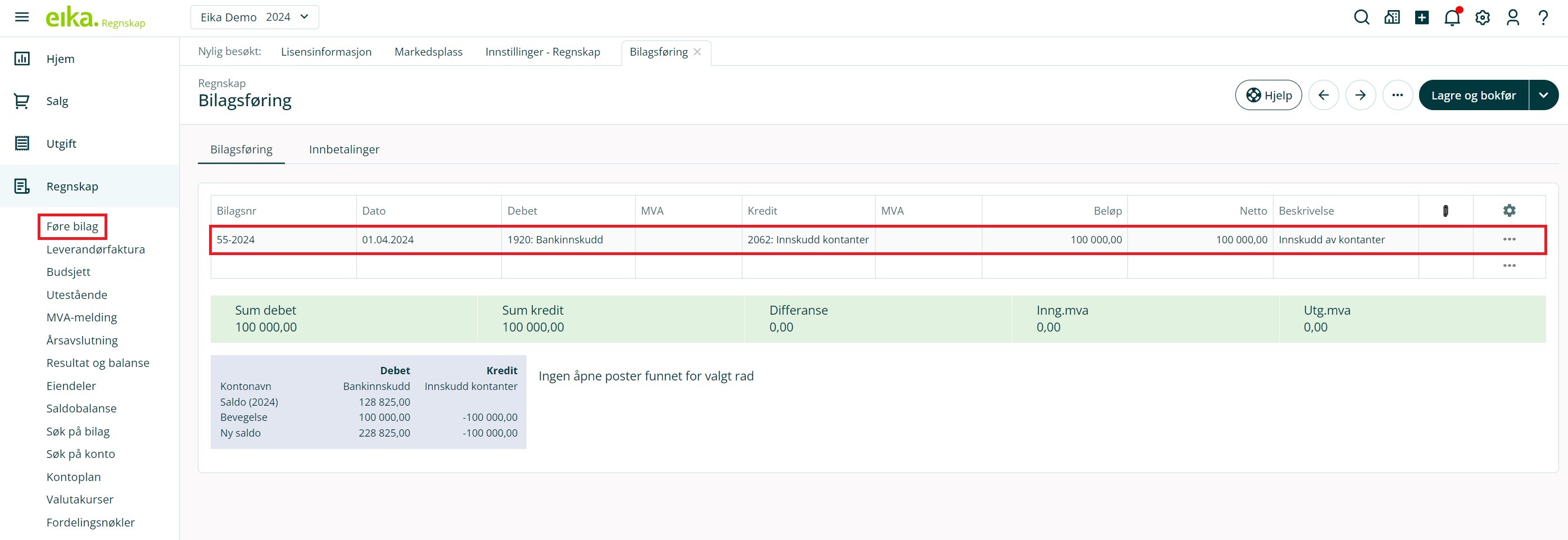Et typisk eksempel er at eier har betalt inn penger på selskapets konto. I dette tilfellet 100.000 kroner, som føres inn debet bank og kreditinnskudd kontanter.