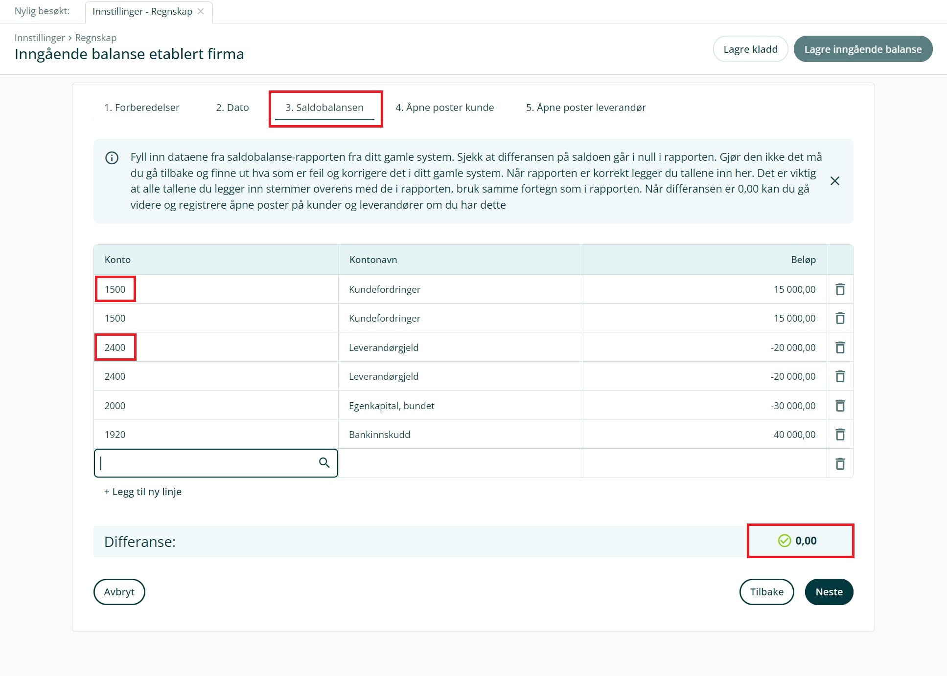 Pass på at rapporten går i null. Hvis ikke har du registret feil beløp eller så er det noe feil med grunnlagstallene fra det tidligere systemet.