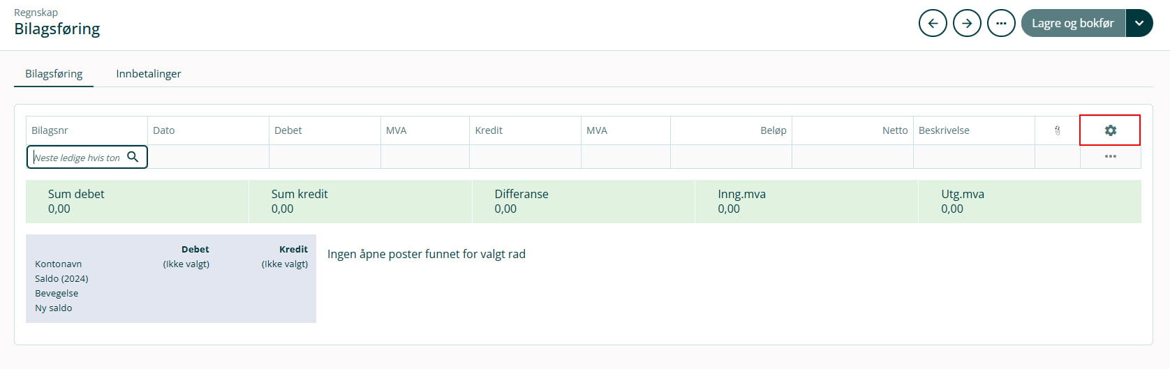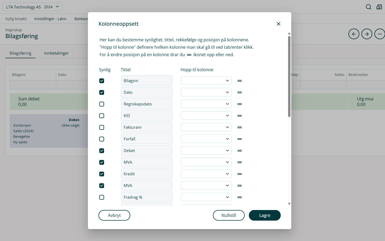 Du kan endre hvilke kolonner som skal vises i for eksempel bilagsføring, i oversikt over inn- og utbetalinger og i fakturaoversikt.