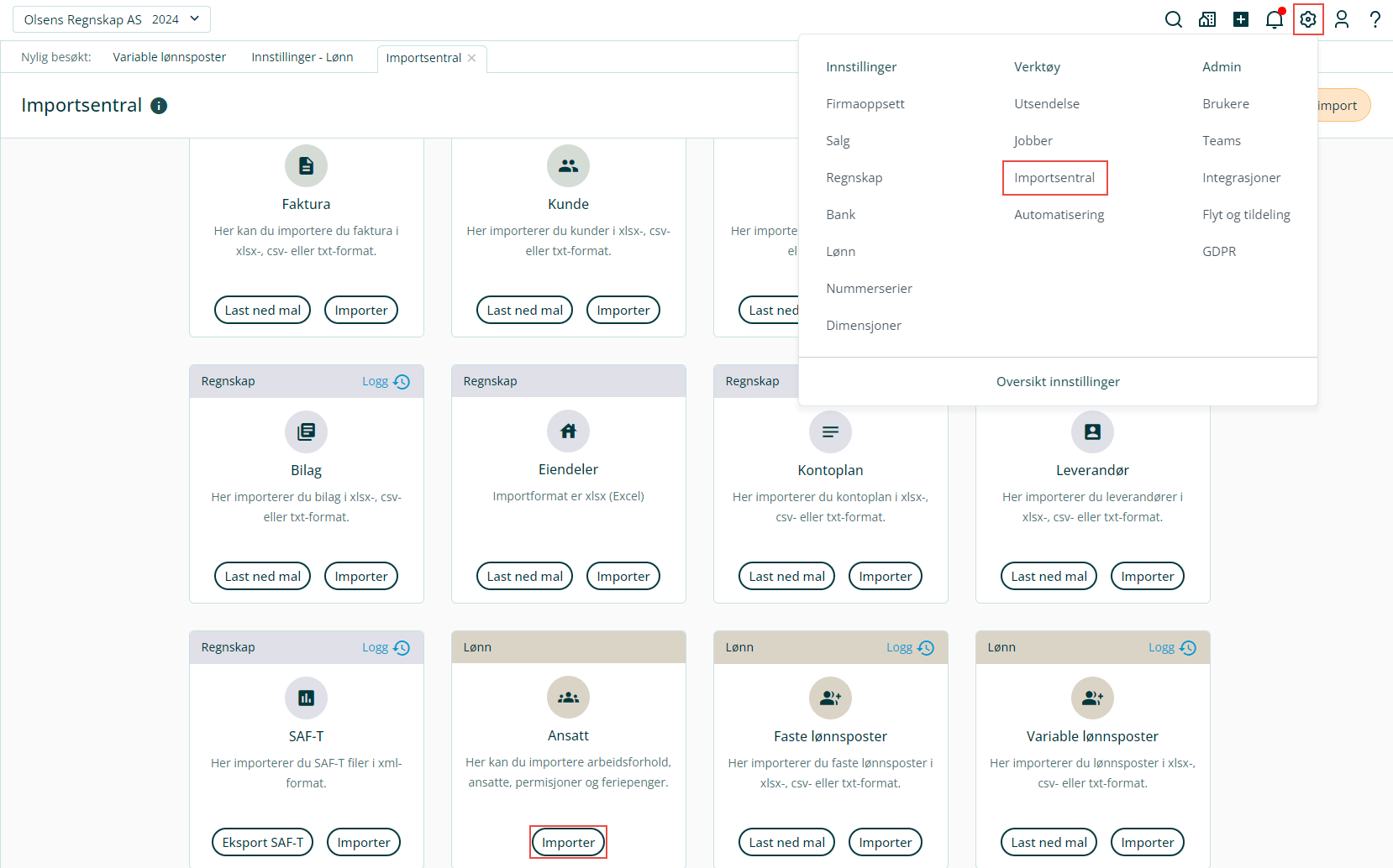 1. Klikk på Innstillinger i toppmenyen og velg Importsentral.