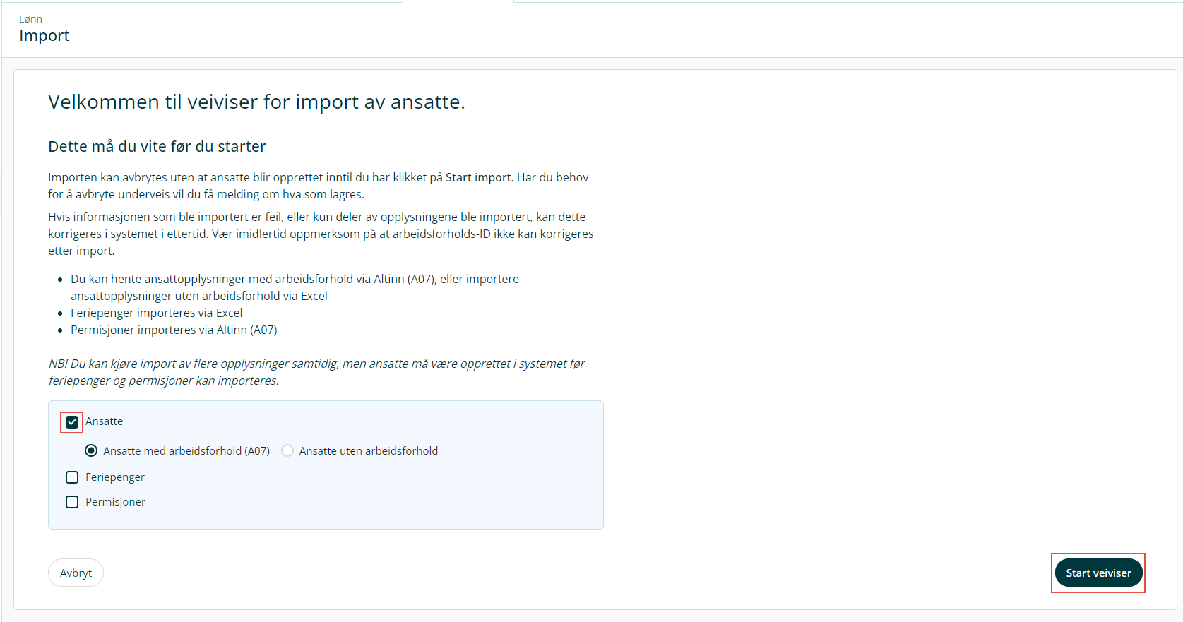 Du kan kjøre flere prosesser samtidig, men ansatte må være opprettet i systemet før feriepenger og permisjoner kan importeres.