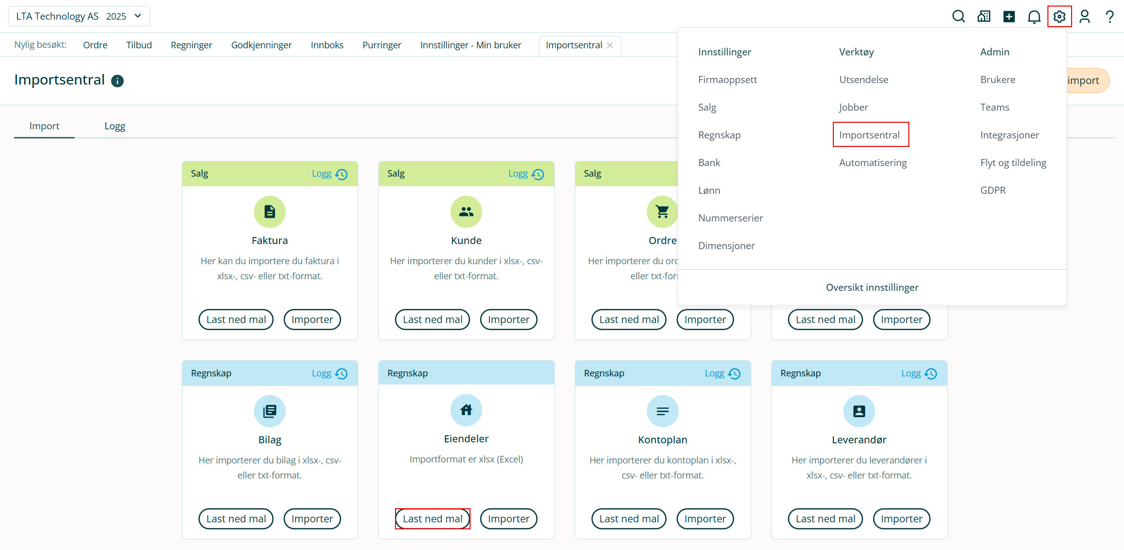 1. Gå til ⚙ Innstillinger i toppmenyen og velg Importsentral.