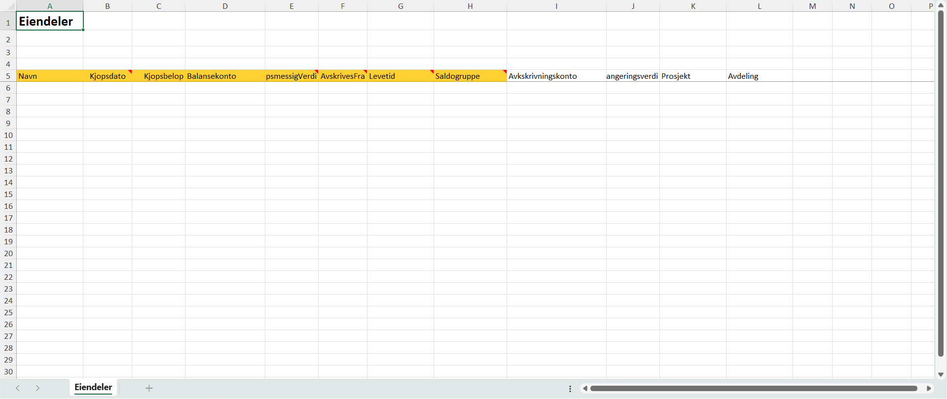 3. Åpne malen og fyll inn informasjon om eiendelene i radene nedover. Kolonnene markert i gul er obligatoriske å fylle ut, resterende er valgfrie. Levetid oppgis i antall måneder. Du kan holde musepekeren over de røde feltene i overskriftene for mer utfyllende forklaringer til feltene. Husk å lagre filen.