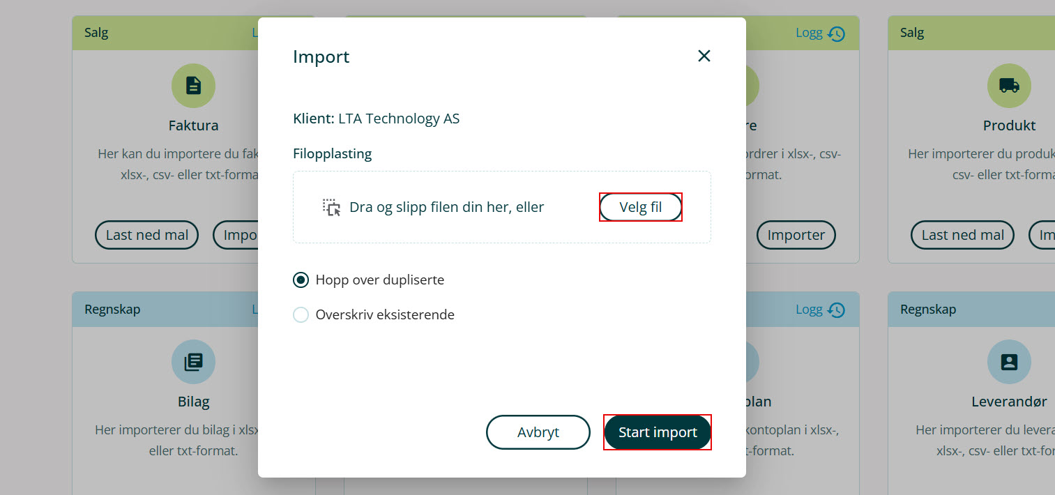 5. Klikk på Velg fil for å laste opp. Du må velge om du vil hoppe over dupliserte eiendeler, eller om du vil overskrive eksisterende eiendeler. Klikk på Start Import.