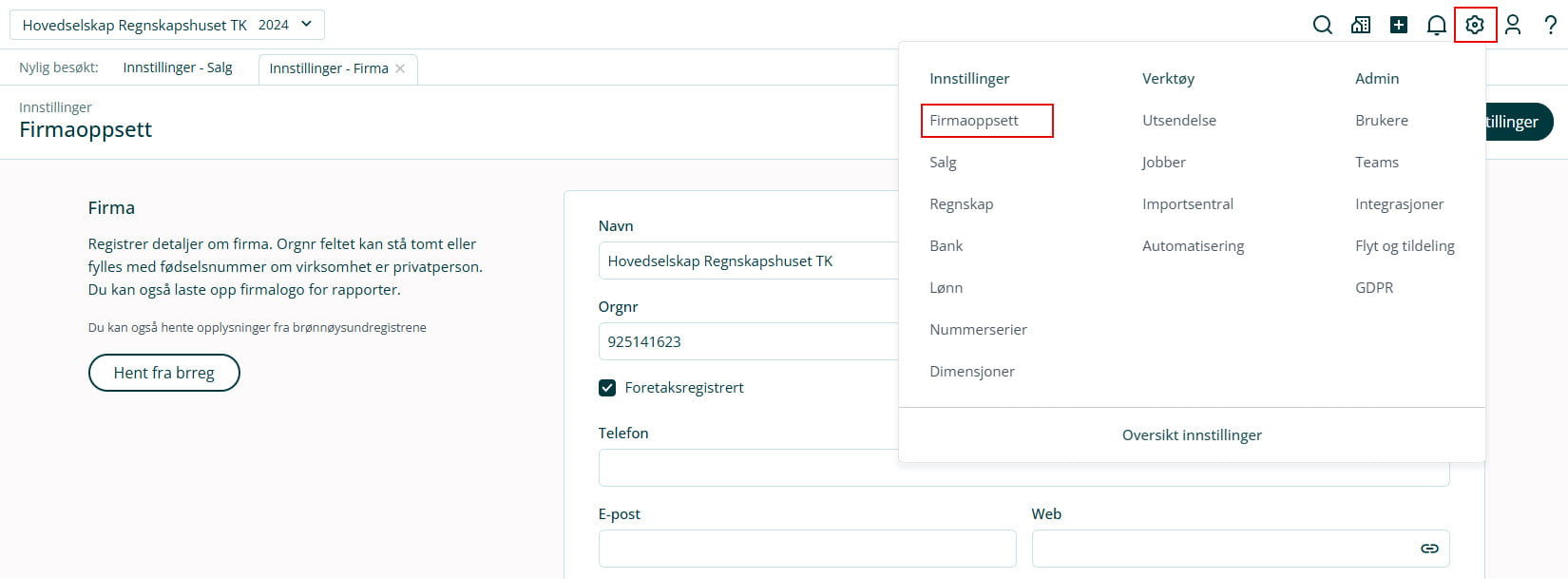 1. Gå til Innstillinger i toppmenyen og velg Firmaoppsett.