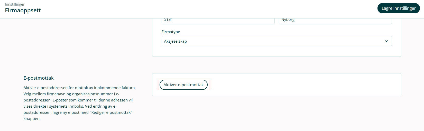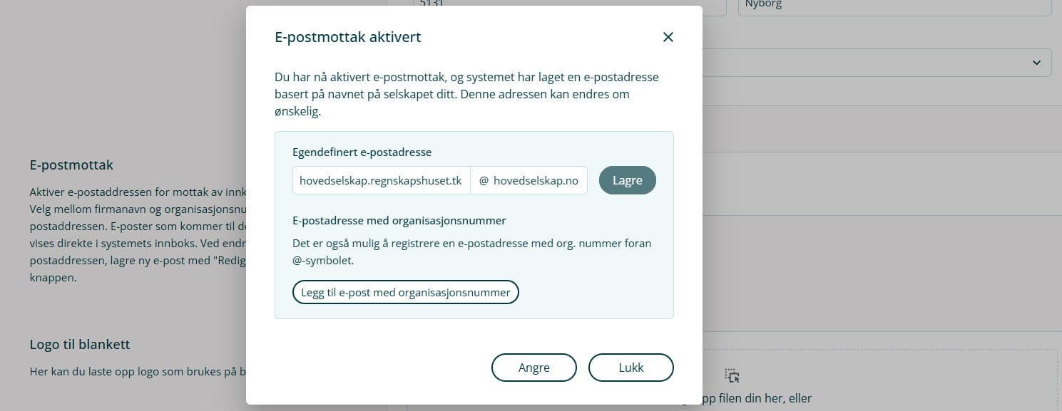 3. E-postmottaket er nå aktivert. Du kan senere endre e-postadressen eller legge til ytterligere en e-postadresse med organisasjonsnummer. Vær oppmerksom på at eventuelle leverandører også må få beskjed om e-postbyttet.