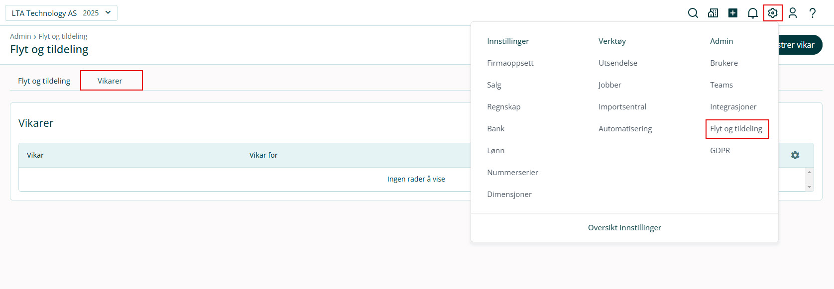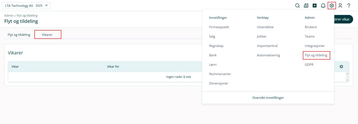 1. Gå til ⚙ Innstillinger i toppmenyen og velg Flyt og tildeling