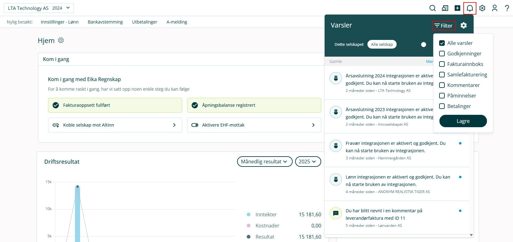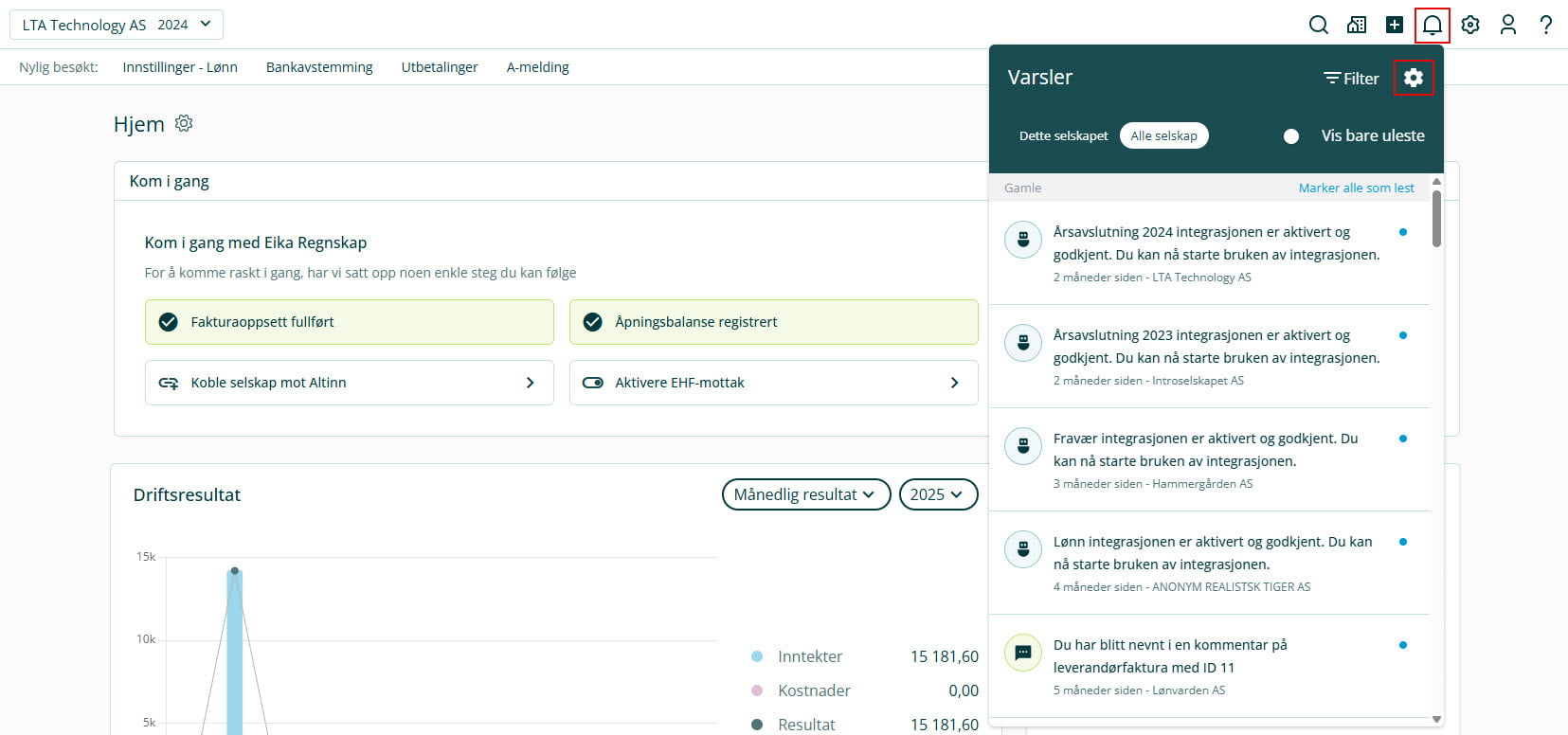 Her kan du se varsel for godkjenninger, nye dokumenter i fakturainnboks, samlefakturering, kommentarer, påminnelser, betalinger og feilede utsendelser. Du kan se varsler for alle selskapene du har tilgang til, eller bare det du står i akkurat nå. Du kan også sette hake ved Vis bare uleste.