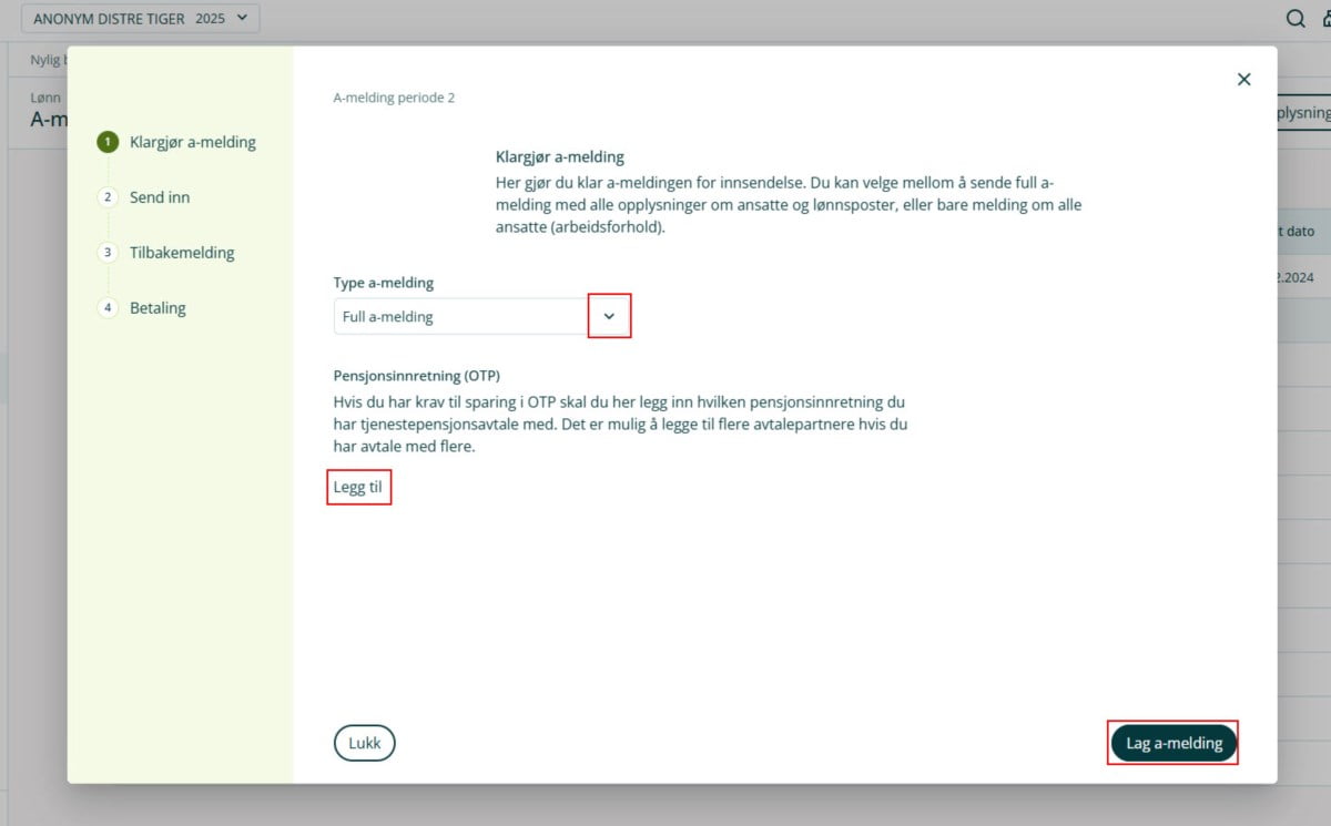 4. Klikk på Legg til pensjonsinnretning og klikk på Lag a-melding.