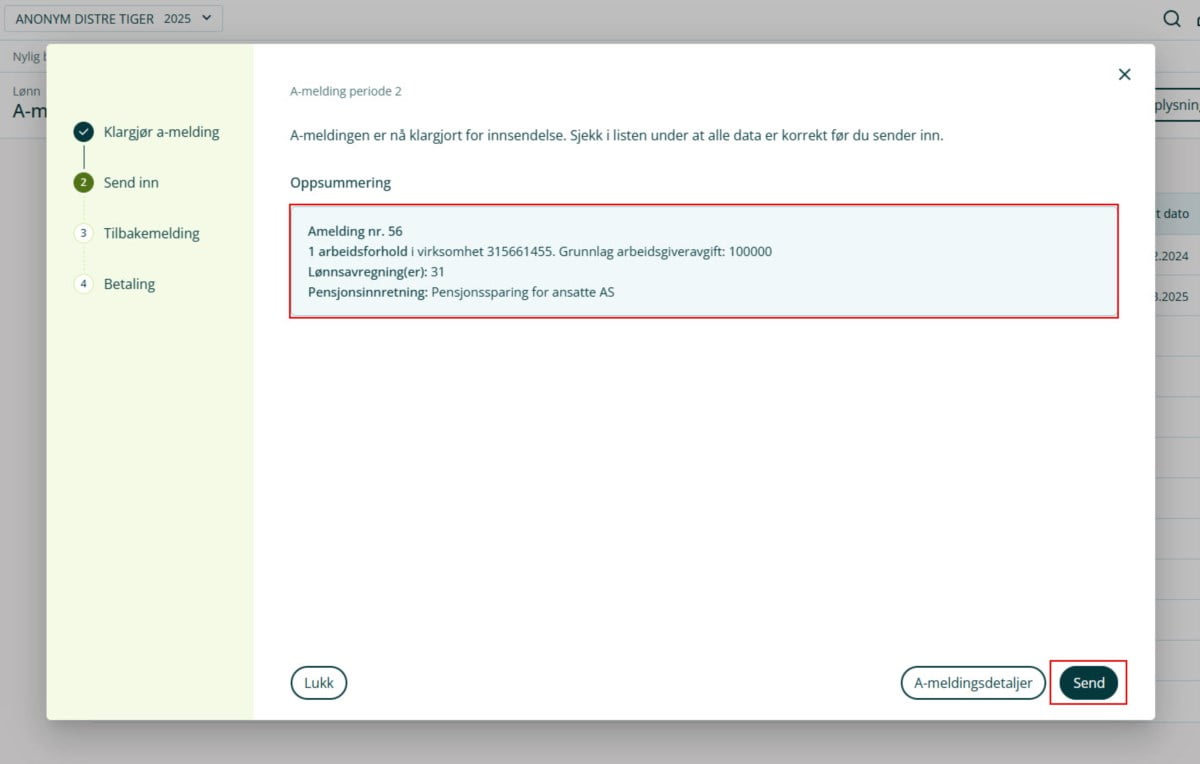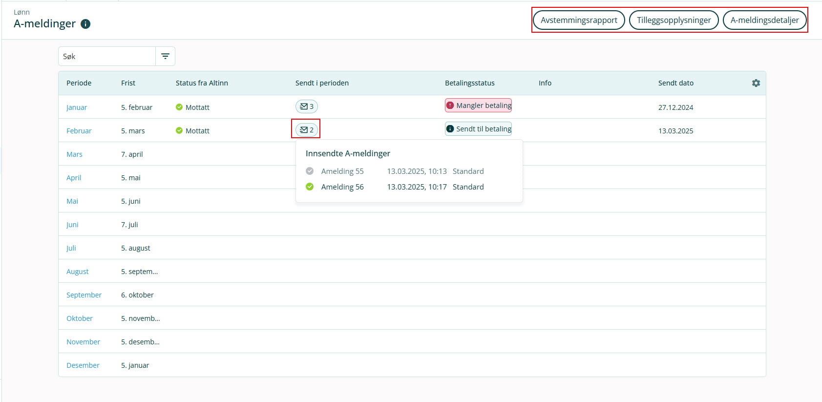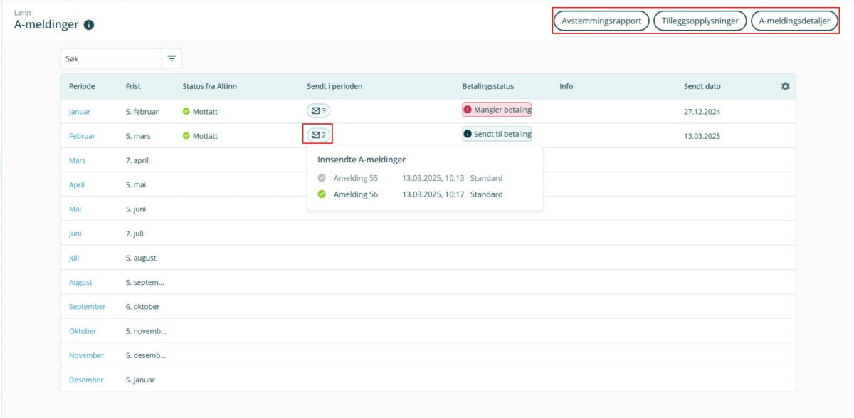 Sendt i perioden: Oversikt over antall meldinger som er sendt for hver periode. Dersom du klikker på konvoluttikonet vises antall sendte a-meldinger for en periode, inkludert informasjon om dato og type melding.