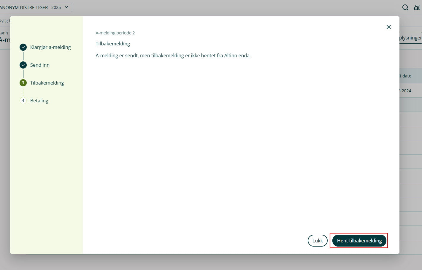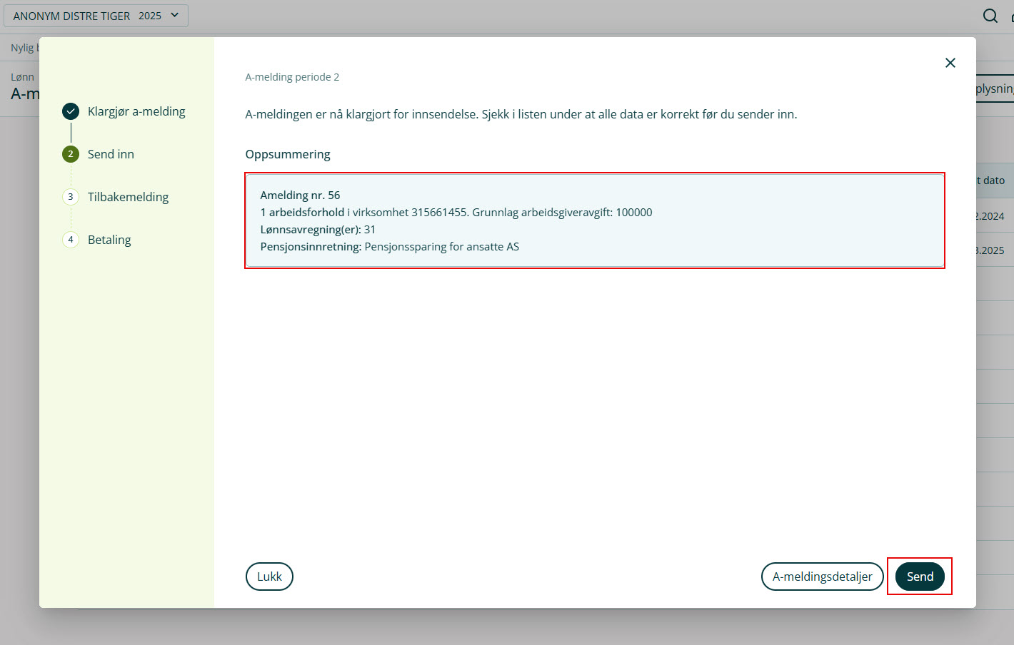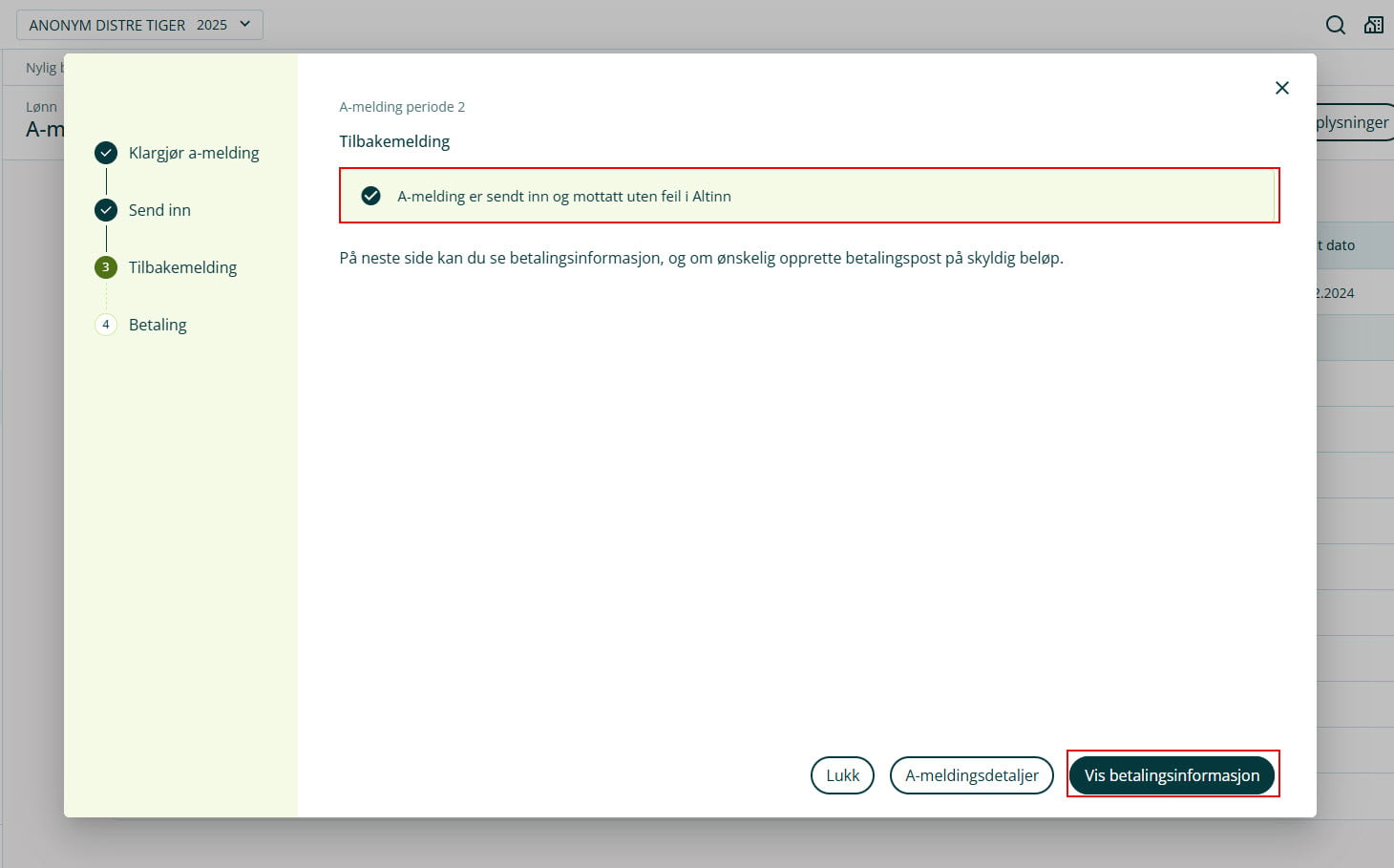 Sendt i perioden: Oversikt over antall meldinger som er sendt for hver periode. Dersom du klikker på konvoluttikonet vises antall sendte a-meldinger for en periode, inkludert informasjon om dato og type melding.