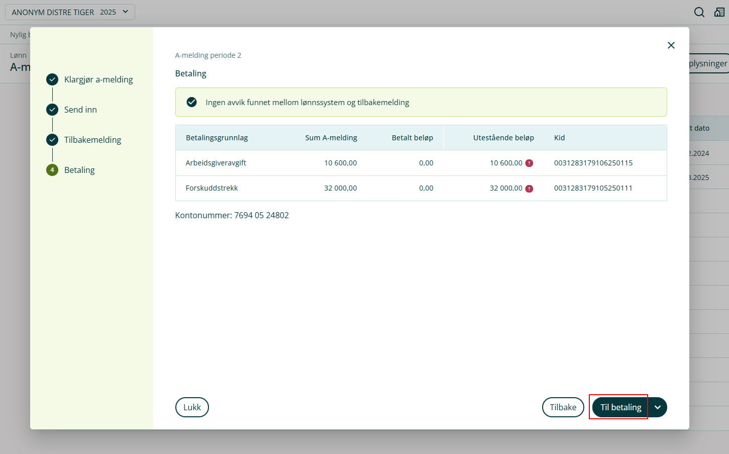Alle poster er registrert som betalt, eller det er bare sendt arbeidsforhold og det er ingenting å betale. - Rød: