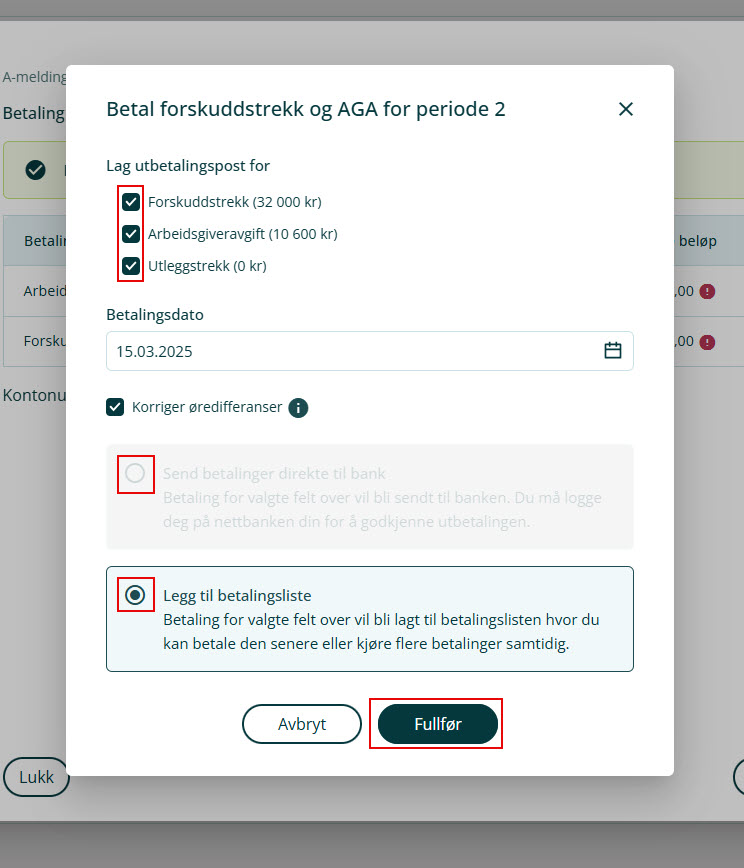 9. Sett hake ved de utbetalingspostene du ønsker å overføre til bank. Dersom du har har aktivert Autobank kan du sette hake ved Send betalinger direkte til bank.