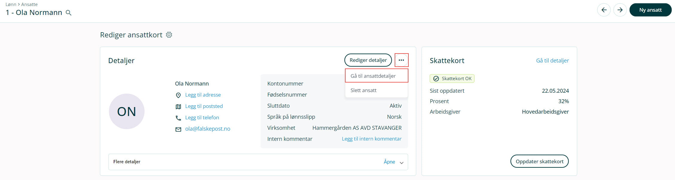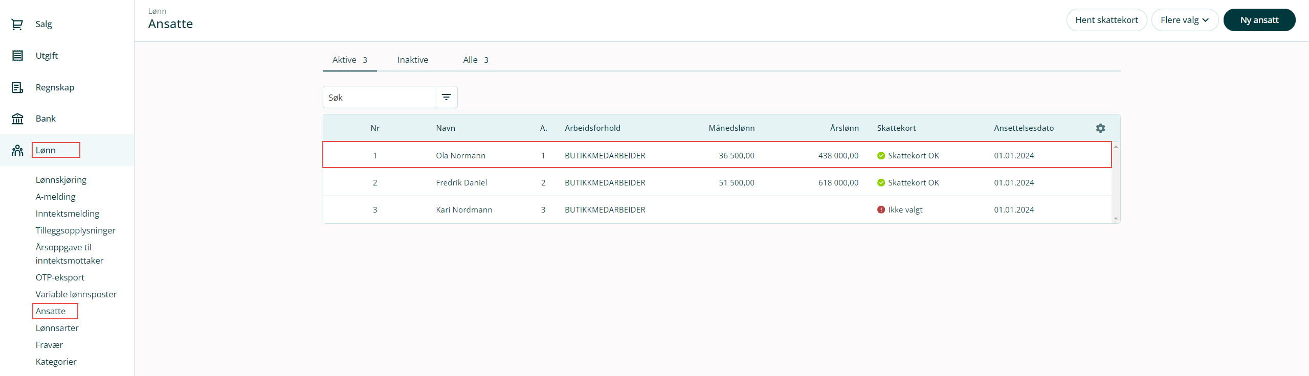1. Gå til Lønn i venstremenyen og velg Ansatte.2. Klikk på aktuell ansatt. Dersom du enda ikke har opprettet den ansatte kan du gjøre det nå.